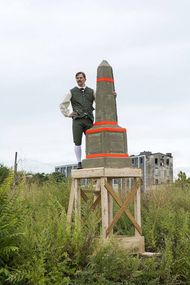 Even more offbeat are the series of photographs of what Colburn calls ‘The Event”. Clothed in 18th-century garb, the artist mounted the enormous obelisk on a wagon and wheeled it through Philadelphia’s streets to be installed in an overgrown lot in Kensington. The performance and mobility of the object usher out any sense of permanence, transforming what a monument aims for: to ensure the permanence of history.