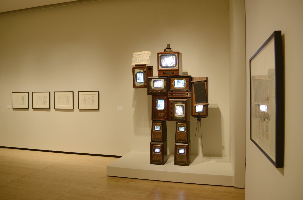 Nam June Paik: Becoming Robot is the right size, rather than the swollen presentations we have come to expect from monographic exhibitions of important artists. It conveys the range of Paik’s thinking, but is intimate enough to allow visitors to actually spend time with the time-based work. It also demonstrates something of the artist’s sense of humor; Paik loved to laugh, and never thought serious ideas precluded humor. The exhibition also reveals just how much we are living in a future that Nam June Paik long anticipated–one that includes digital television, portable electronic devices, the domestic use of computers, the internet, Google Glass, Facebook, Skype, online education, and a range of other networked activities.