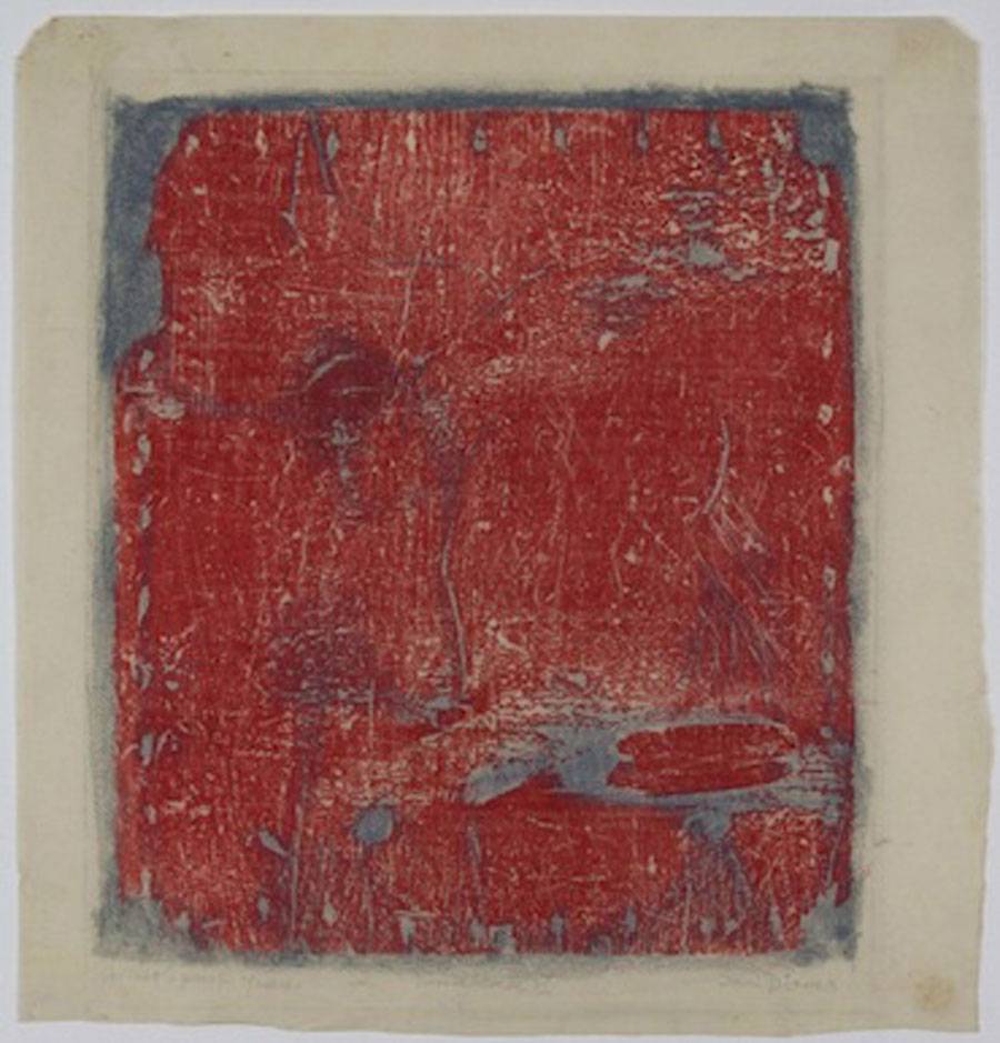 Dienes worked in a huge range of media, including installations with bottles, paintings in snow, collage and assemblage, prints and rubbings, machine photocopies, theater sets and costumes, textile design, and performance works, as well as acting on stage and in film, and writing poetry. I suspect her protean nature is in part responsible for curators’ neglect of her work. In the early 1950s, she had several exhibitions at Betty Parsons Gallery–at the same time the dealer was showing the work of Pollock, Still, Rothko, and others whose emotive work was very different from hers–but moved away from commercial representation afterwards, which is another likely reason her reputation has not been properly maintained. A highly varied career–hence lack of a signature style–can be a liability for an artist’s sales, but should not preclude historical consideration.