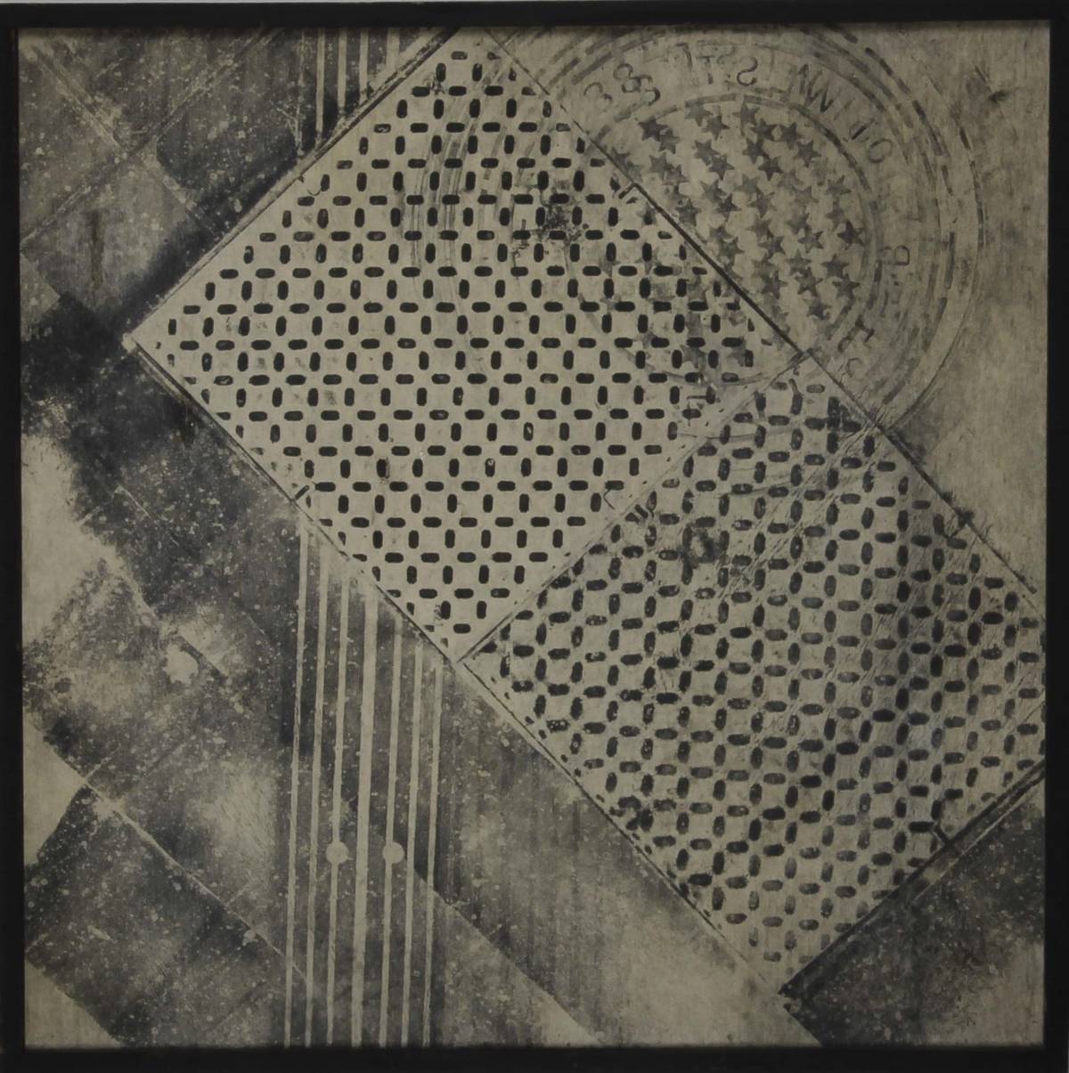 The exhibition concentrates on a series of work from the early 1950s, and a table case of related ephemera. With the exception of one woodcut, the work consists of large rubbings, the sources of which were textures Dienes found embedded in New York City streets–including manhole covers, subway grates, and sidewalks. She had learned rubbing from Ernst, but definitively made it her own. The rubbings resemble large, black-and-white collages of geometric and evenly-patterned elements, on a scale of much of the large painting of the time, and with similar presence.