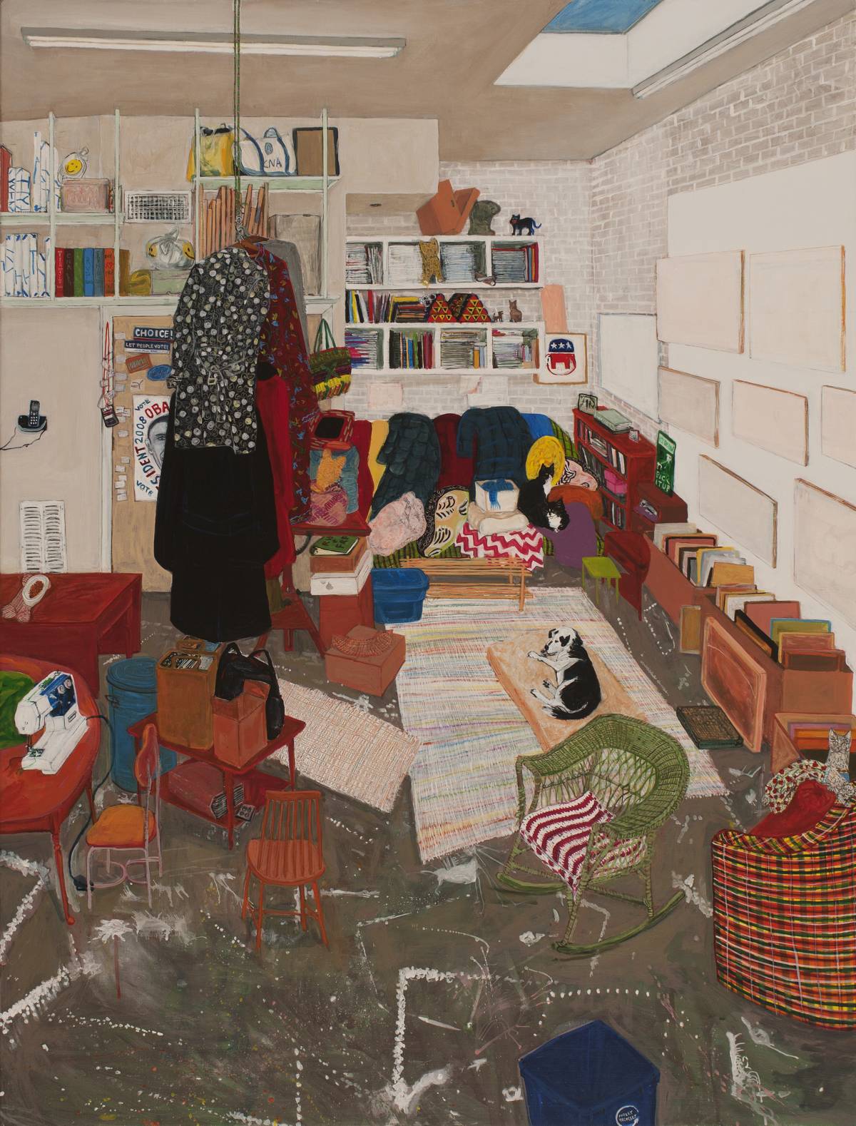 A word about the beautiful and inviting physical detail found in McEneaney’s paintings. The floor in her Rampart Street studio in New Orleans; the screen behind her bed in her dog beach dream; the hammock on Shelter Island. Cats’ eyes. One could go on and on: stucco townhouses with lacy ironwork façades, ceilings, bricks, fabrics, fences, rugs. All are rendered with an exquisite, sometimes glorious richness that contrasts with a world of more banal detail: a smoke detector, recycling bins, a sewing machine, an Obama poster.