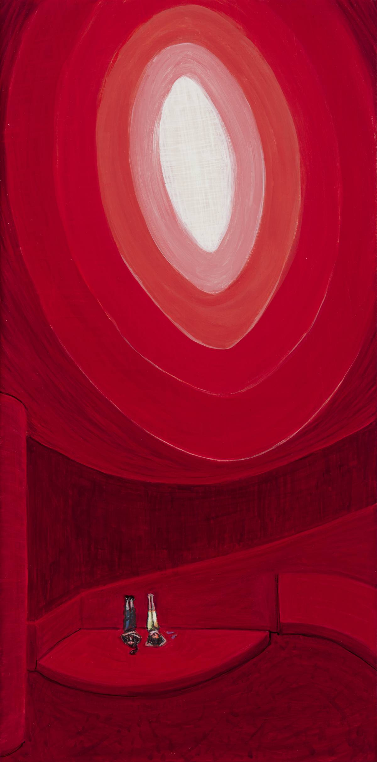 An outlier in the exhibition is McEneaney’s Sanskrit-titled “Urdhva Prasarita Padasana,” in which two Lilliputian figures take the L-shaped yoga posture (backs on the floor, legs at 90 degrees up against the wall) in what could be a huge auditorium of various satin reds beneath a vortex of white light. I immediately thought of Turrell (having had the privilege years ago to visit the Roden Crater), and learned later that the painting was inspired by a visit to his Guggenheim exhibition, apparently by one of his Skyspaces.