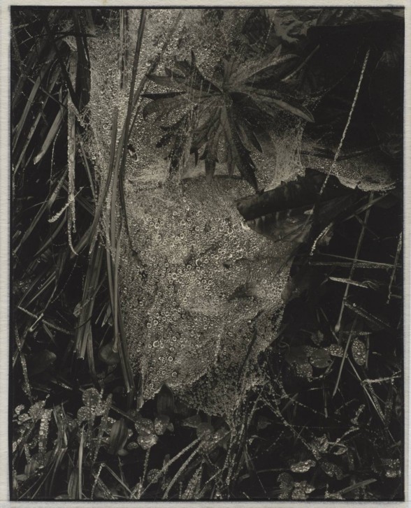 An element of the Pictorialist way that never quite died off in Strand’s work was his attention to making prints of such technical precision and beauty that they could stand up to paintings in the gallery. Photographic technologies and trends were constantly changing and updating during this time, but Strand preferred and mastered the platinum print, silver gelatin print, and photogravure. He valued clarity and nuance in his negatives as well, and as such, almost exclusively made contact prints as large as 8″ x 10″ from his beloved reflex cameras. “Cobweb in Rain” is presented as one of the artist’s original platinum prints (the process was so tedious that usually only one or two prints were made of each image, making them even more precious). In person, the unbelievable tonal depth and slightly tepia hue invite a complete immersion into not only the landscape, but Strand’s mind.