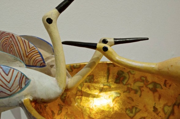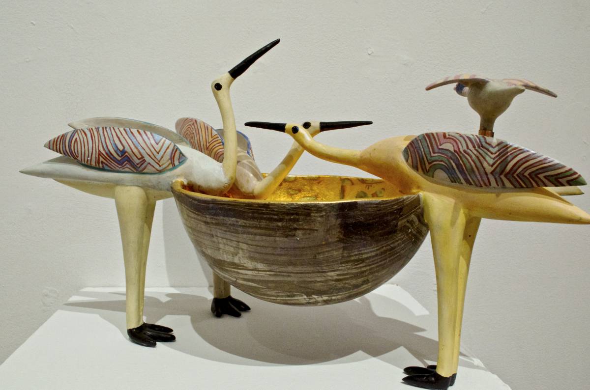 For the more grown-up taste is Gretchen Ewert, whose sophisticated urns look as if they were stolen straight from a pharaoh’s palace. Ewert’s one-of-a-kind works are influenced by primitive religious artifacts. “Waterbird Extravaganza” is a precious bowl suspended by three cranes (and a little bird friend on the back of one of the cranes) drinking from its gilded interior. The exterior of the piece is painted in matte hues, the wings of the cranes decorated in a simple line motif, and the exterior of the bowl painted similarly to the outside of an abalone shell. The inside of the bowl is coated with 22-karat gold for an effect nothing short of stunning. The birds, and the bowl, feel precious and ephemeral.