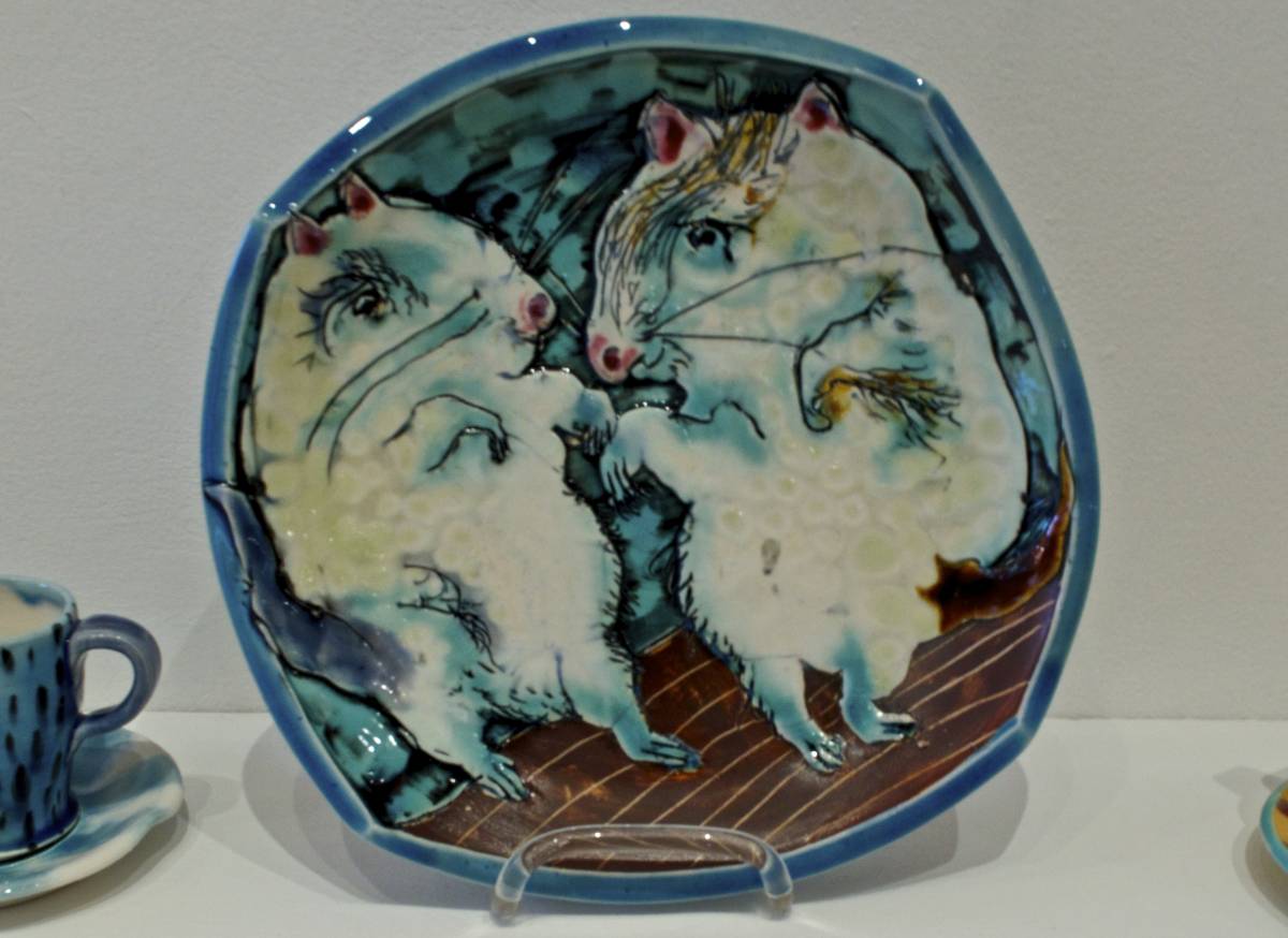 Included in the show are porcelain artist Bernadette Curran, potter Ron Meyers, ceramicist Gretchen Ewert, and fiber artists Renee Harris and Susan Aaron-Taylor. Curran contributes an array of delicate and whimsical fairytales formed from an equally delicate and whimsical material: porcelain. “Dating Rats Platter” (that title is perfect, by the way) is one of her standout pieces–two (very cute, I have to add) rats appear to be strolling down some sort of painted porcelain promenade and (hopefully not) out of the platter. The rats are painted in a style vaguely reminiscent of Chagall’s animal illustrations. The rats also present a sort of narrative, something straight out of Aesop’s Fables or a child’s storybook. It’s a comical thought, though: people go to great lengths to keep rats as far away from their food as possible, and Curran brings the rat right to the plate–Curran’s rendition of “Ratatouille,” perhaps?