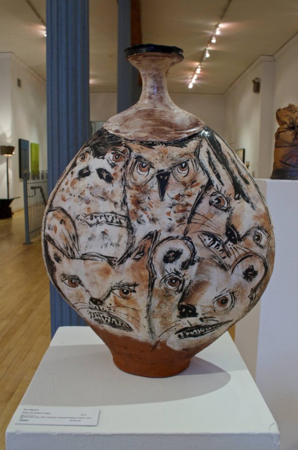 Ron Meyer’s “Bottle with Multiple Images” is a piece that looks as if it were taken out of a Paleolithic cave. The 22” tall earthenware creation has a wide, circular body and tapers into a skinny spout at the top. It’s festooned with mildly menacing animal faces–the angry mugs on a bear, owl, frog, wildcat, and rabbit (they can be frightening) peek out from one another on the front of the bottle in natural hues of burnt sienna, burnt umber, and black, painted in a sketchy, rough translation. The bottle almost appears to be a cave itself; all of the creatures are peeking out from the depths and it makes the viewer wonder–are we afraid of the creatures in the cave, or are they more afraid of us?
