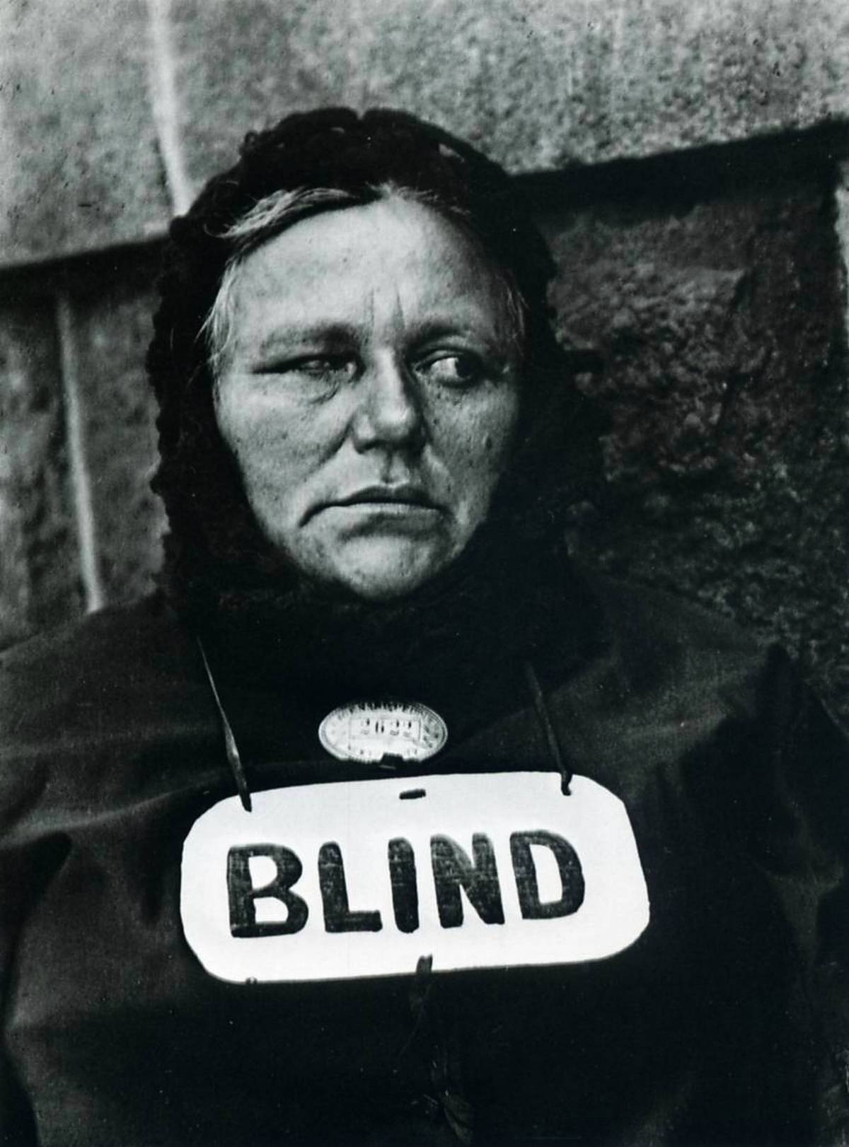 From a semiotic point of view, the sign reads like a label that reduces her identity to the visual perception of those who have the power to observe her. In this sense, the sign is as much an accusation as a proclamation, suggesting that the voyeur who “sees” her is blind to her humanity. Compounding the dehumanizing effect is the peddler’s badge, which diminishes her dignity as well as her identity, since peddling was all too often a euphemism for begging. She is not an individual, but a member of a marginalized, stigmatized, ostracized group, as if she were Jew in Nazi Germany with a gold star on her sleeve.