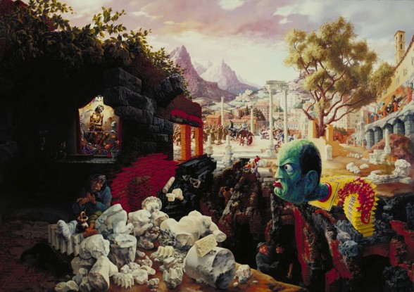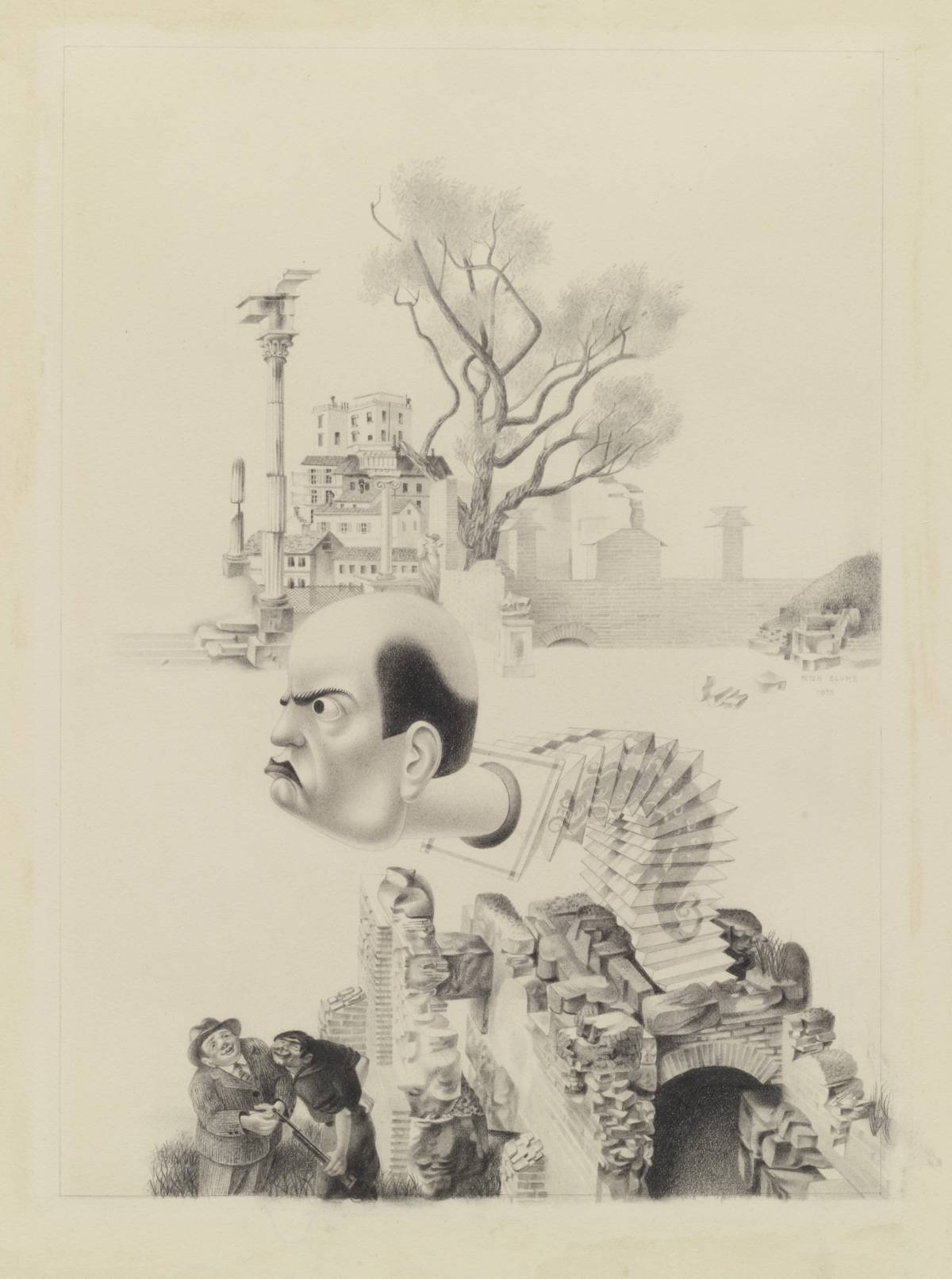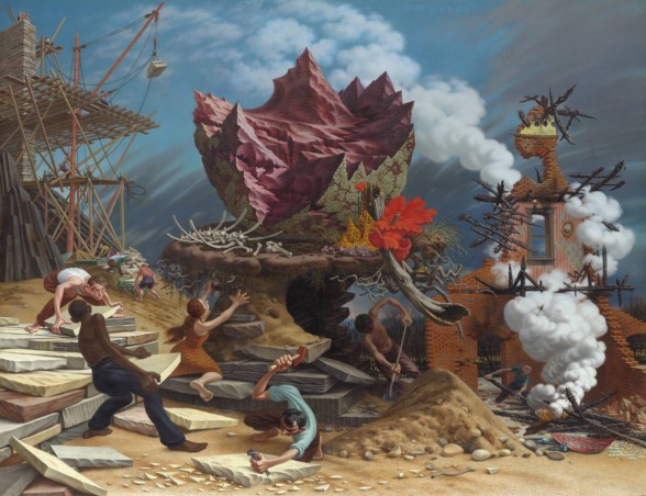 Peter Blume: Nature and Metamorphosis, a large and well-conceived survey of the artist’s career, is at the Pennsylvania Academy of the Fine Arts (PAFA) through April 5. If the artist’s name is familiar, it’s likely you’ve spent time at the Art Institute of Chicago (AIC), where you’ve seen “The Rock” (1945-48). It is the only work of Blume’s I’ve seen on any museum wall until now, and it’s a showstopper. A group of figures are rebuilding within a post-apocalyptic landscape, dominated by a huge, mysterious, split-open rock with the portentous quality of the monolith in “2001: A Space Odyssey”. The imposing painting caught the attention of Robert Cozzolino, PAFA’s senior curator and curator of modern art, who organized the exhibition, as it did mine. “The Rock” is obviously the work of an extremely accomplished and imaginative painter, yet also an extremely odd one. Odd because Blume’s world is unlike anyone else’s.