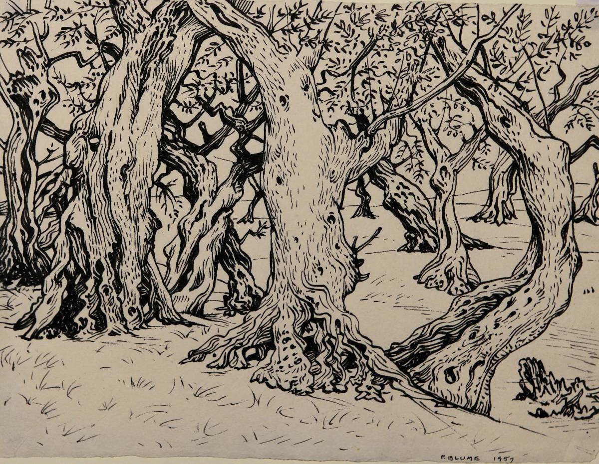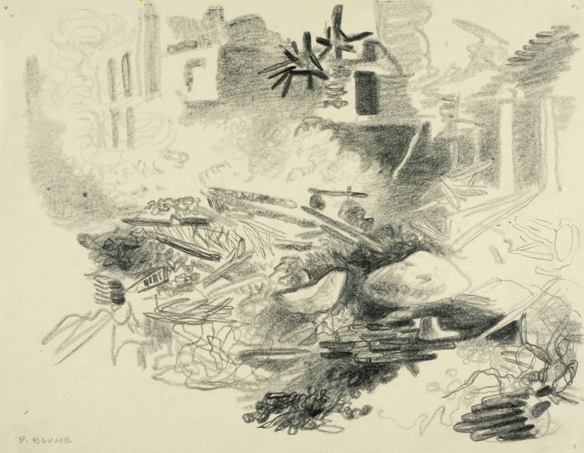 The artist considered himself a realist, by which he meant that he portrayed what he understood of the world, not literal pictures of what was before his eyes. His paintings are faithful to our common reality in their details, but add up to something other in toto. Blume has sometimes been described as a Surrealist, an association he denied, and he staunchly avoided being associated with any group or movement. The emotional tenor of his work is closer to the Cold War and science fiction movies of the 1950s than to Surrealism. Those films and Blume’s paintings portray a world familiar, yet strange, whose populace attempts to carry on in the face of pervasive unease about an unknown and menacing future. They were all among the fallout of the atomic bomb.