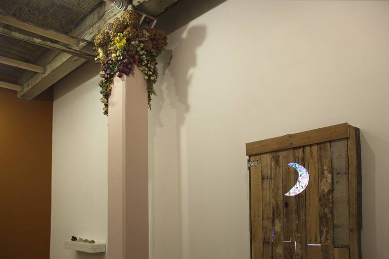 “From shit comes flowers that over time return to shit and back again,” explain Alison Wong and John Charnota, the two artists behind It’s Like Shit and Flowers, on display at Grizzly Grizzly. The artist-couple transforms the gallery’s intimate space into an ironically clean ode to fecal matter adorned with a bouquet of dried flowers hung from a solitary column, with an aromatic scent that permeates the space.