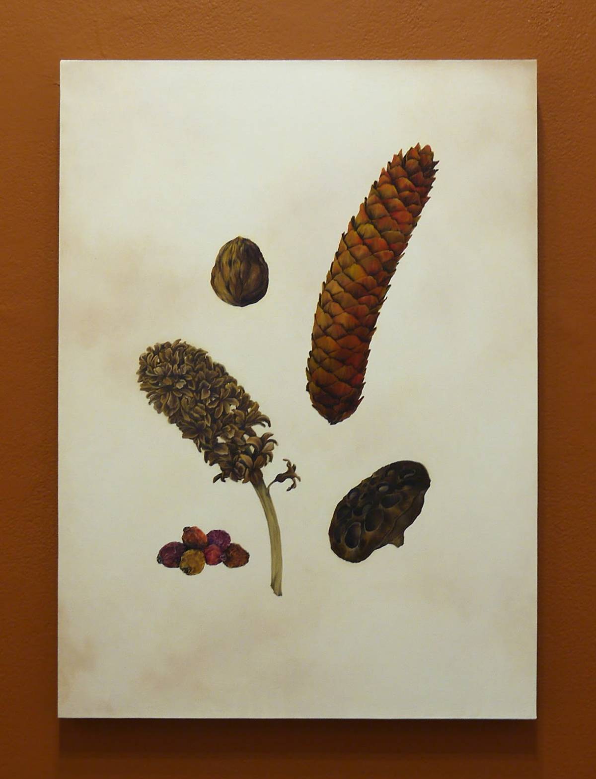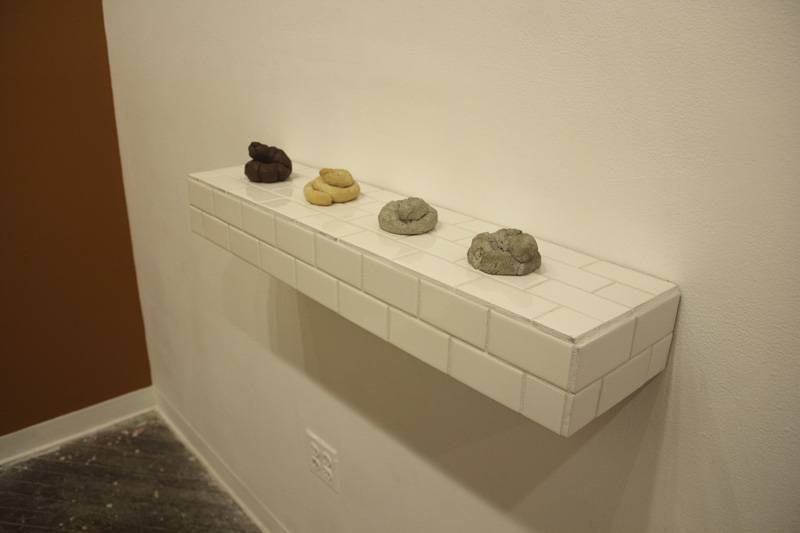 Opposite the column, contrasting the modern gag use of fake poop, is a series of four material studies in a row, atop a pristine, white-tiled, bathroom-esque surface. Each seems like a step in a step-by-step depiction of a poop’s degradation over time, from the fudgy pile of clay into the petrified, ghostly feces made of a cement-like material that Charnota mixed with sawdust. Like the outhouse, the material studies elevate poop as the primary subject and suggest that they are of the same caliber as the intricate oil painting of plants to their left.