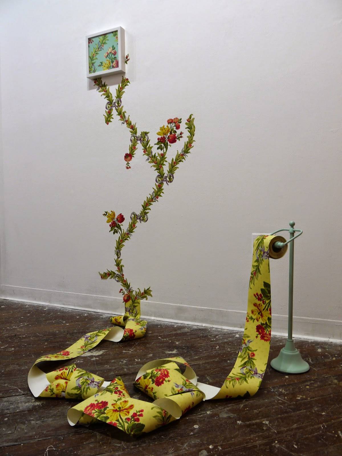 In many ways, the interconnected nature of the exhibition fuels a general sense of collaboration and harmony within the space. Somehow, the two artists are able to elegantly arrange piles of crap in the same room as lavish, floral toilet paper that creeps up the walls and dissolves into a tightly cropped, framed work of art that is the most thoroughly developed piece of the show. The toilet paper stand cleverly, and cohesively, blurs the line between bowel movements and the beauty of the flower patterned toilet paper.
