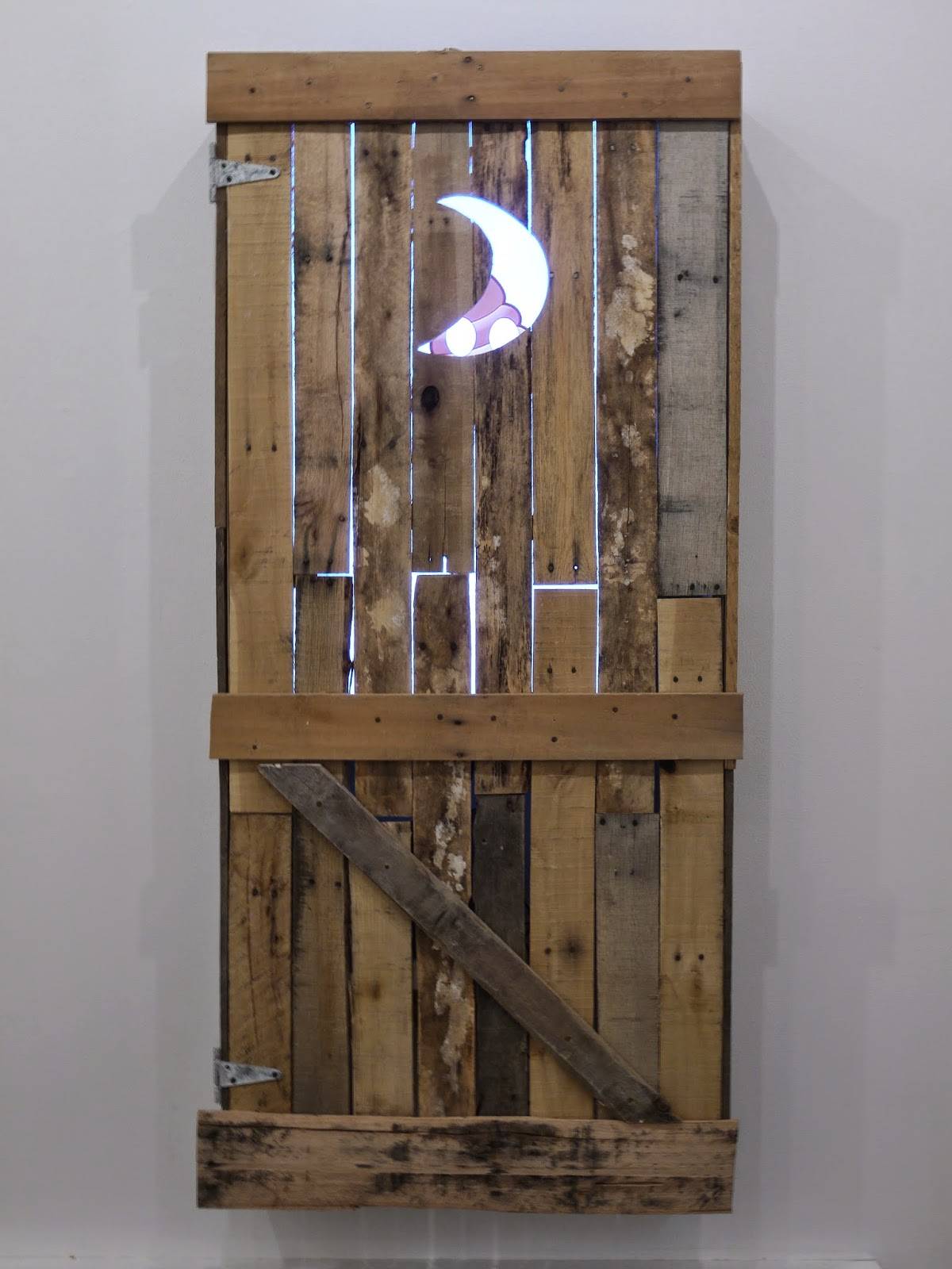 On one end of the gallery is a wooden outhouse door emerging from the wall, backlit by a flashing screen of vibrant streaks of color and dancing poop emojis. The unsettling imagery of the smiling pile of poo is removed from the putrid aspects of shit, placing it in an elevated, decorative light. The resulting outhouse installation meditates on our strange fascination with the digital, smiling poop emoji as to highlight the absurdity of the image and media’s ability to strip an object, such as poop, of its original meaning as to completely redefine the context in which the imagery is used.