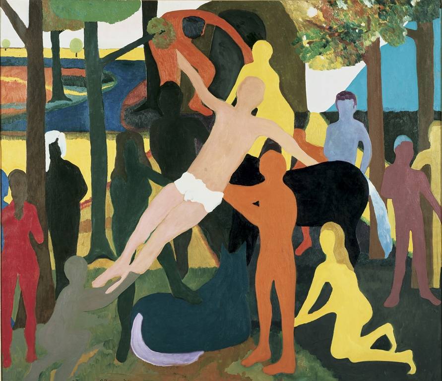 “The Deposition” (1961) by Bob Thompson is an important work by another artist notable for rendering religious subject matter–even rarer among serious artists of his generation than in Tanner’s–in the visual language of his day. Done on the artist’s first extended residence in Europe, the painting represents the beginning of his characteristic citation of European old master paintings.
