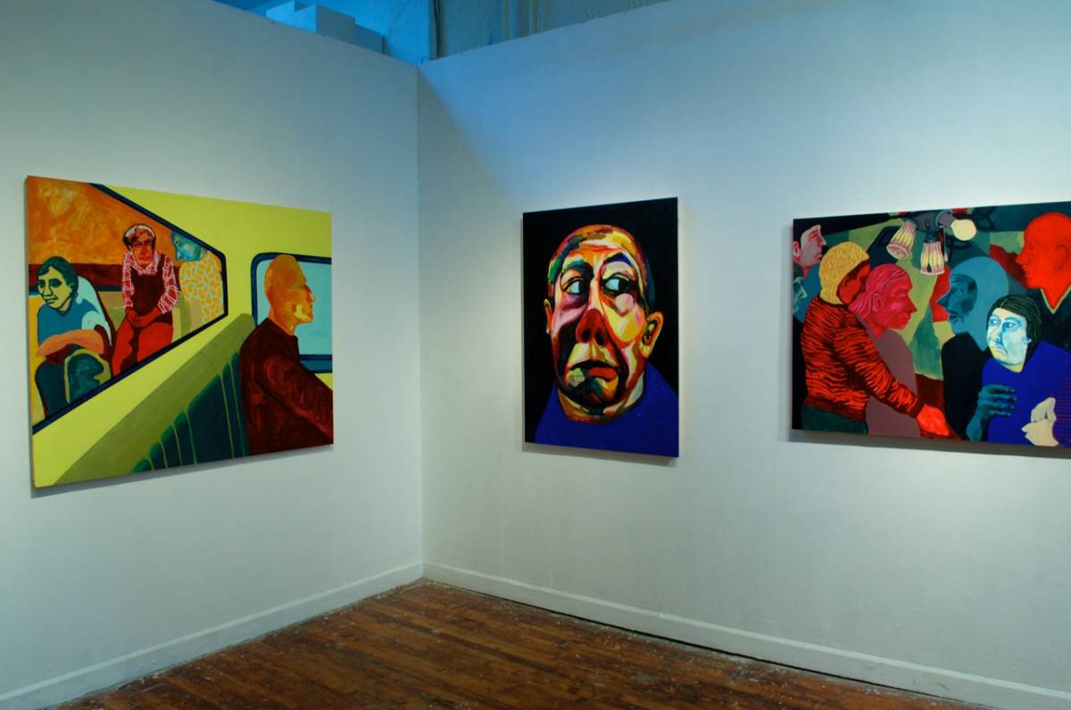 The feel of the piece is a dilapidated bar, long past its prime, filled with the last of its skeezy, drunken occupants. The blue figure and the kneeling figure seem to be engaged in some kind of sexual exchange–is this the lover of one of the angry figures caught in an act of betrayal? Is the figure drunk and looking for her phone on the floor while friends in the back angrily cry for her to hurry up because their Uber has arrived?