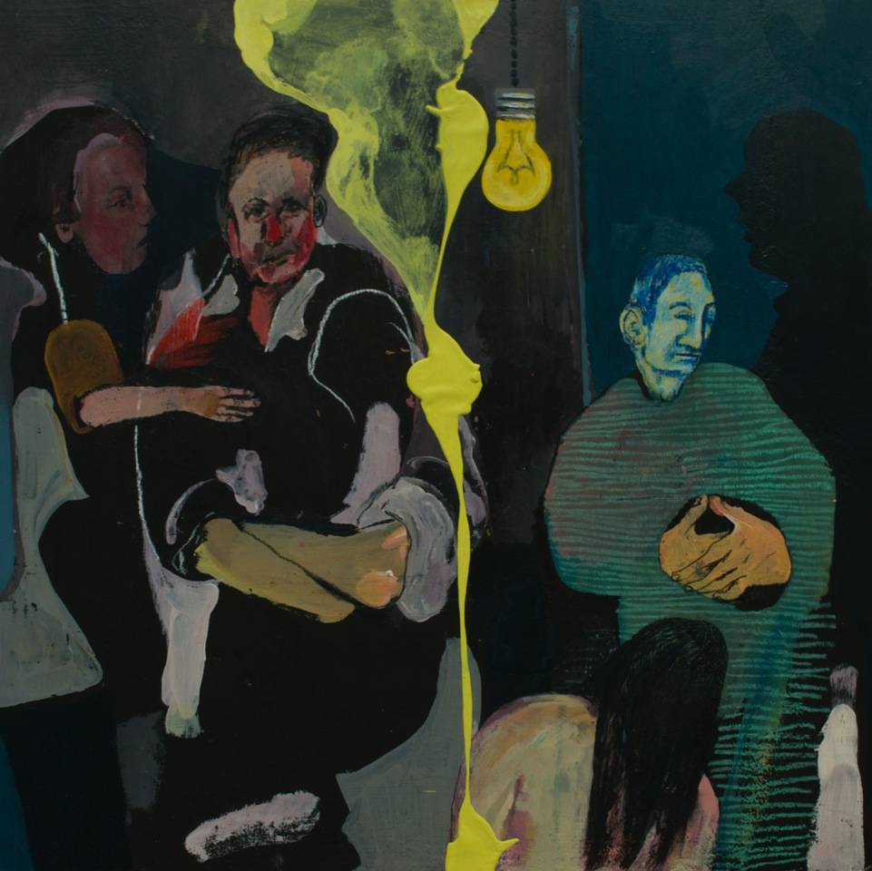 Dark teal and cool, deep fleshy tones are offset by a brilliant yellow light bulb emitting a light billowing out like cigarette smoke. The blue-striped figure on the right has a drunken expression on his/her light blue face; two figures behind in the distance look on disapprovingly, one of the characters almost holding the other back. A crude, quick painting of the back of head and shoulders sits before the figure.