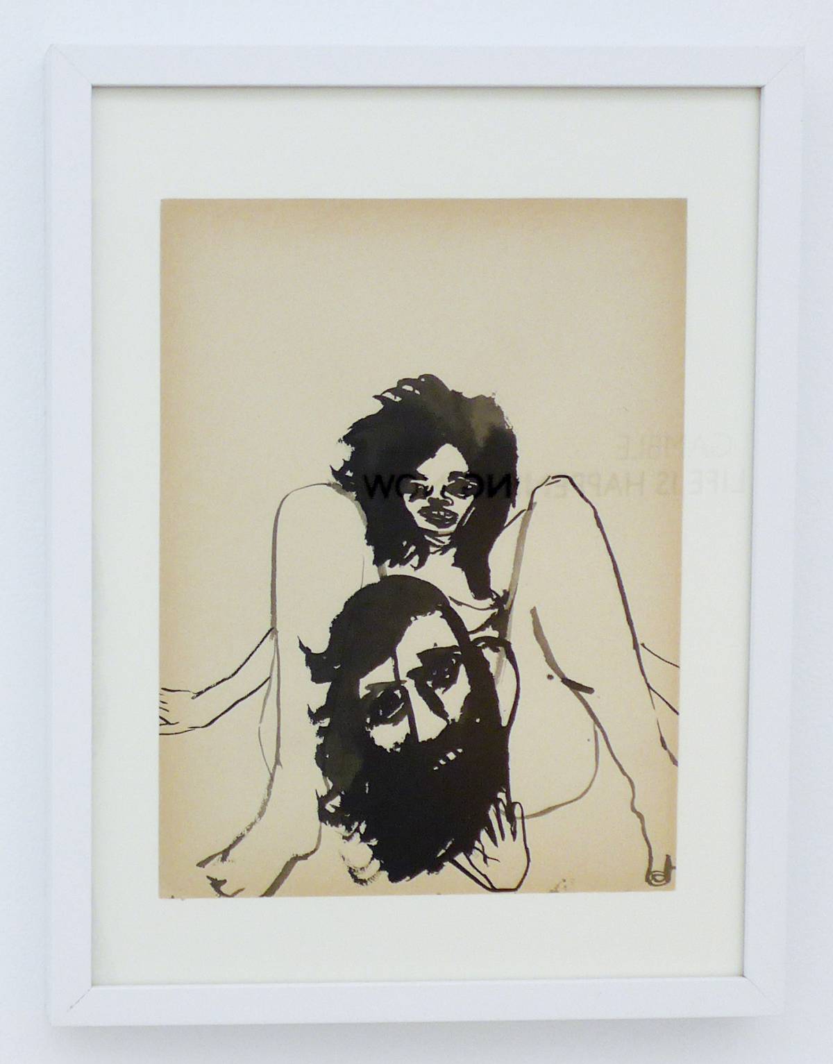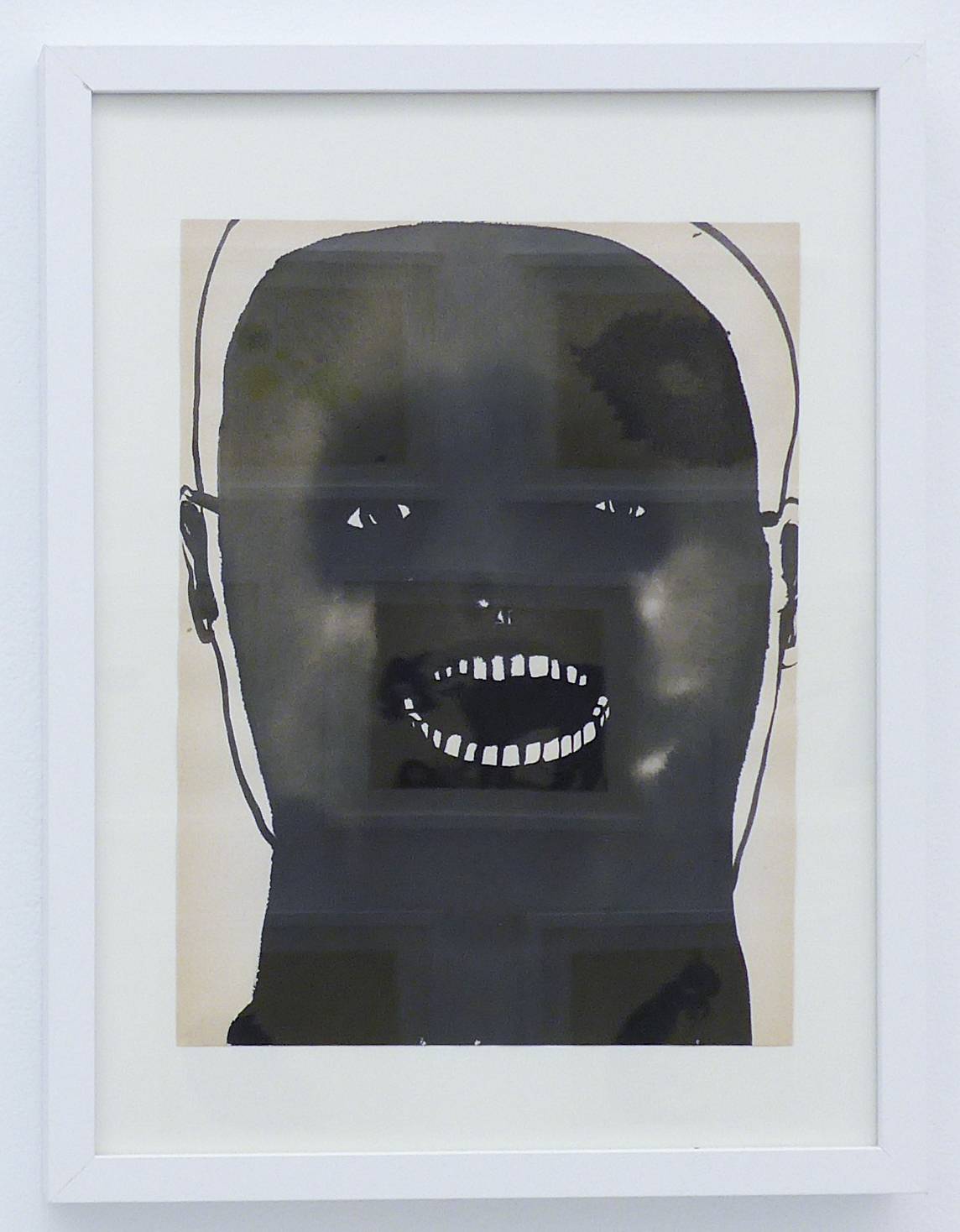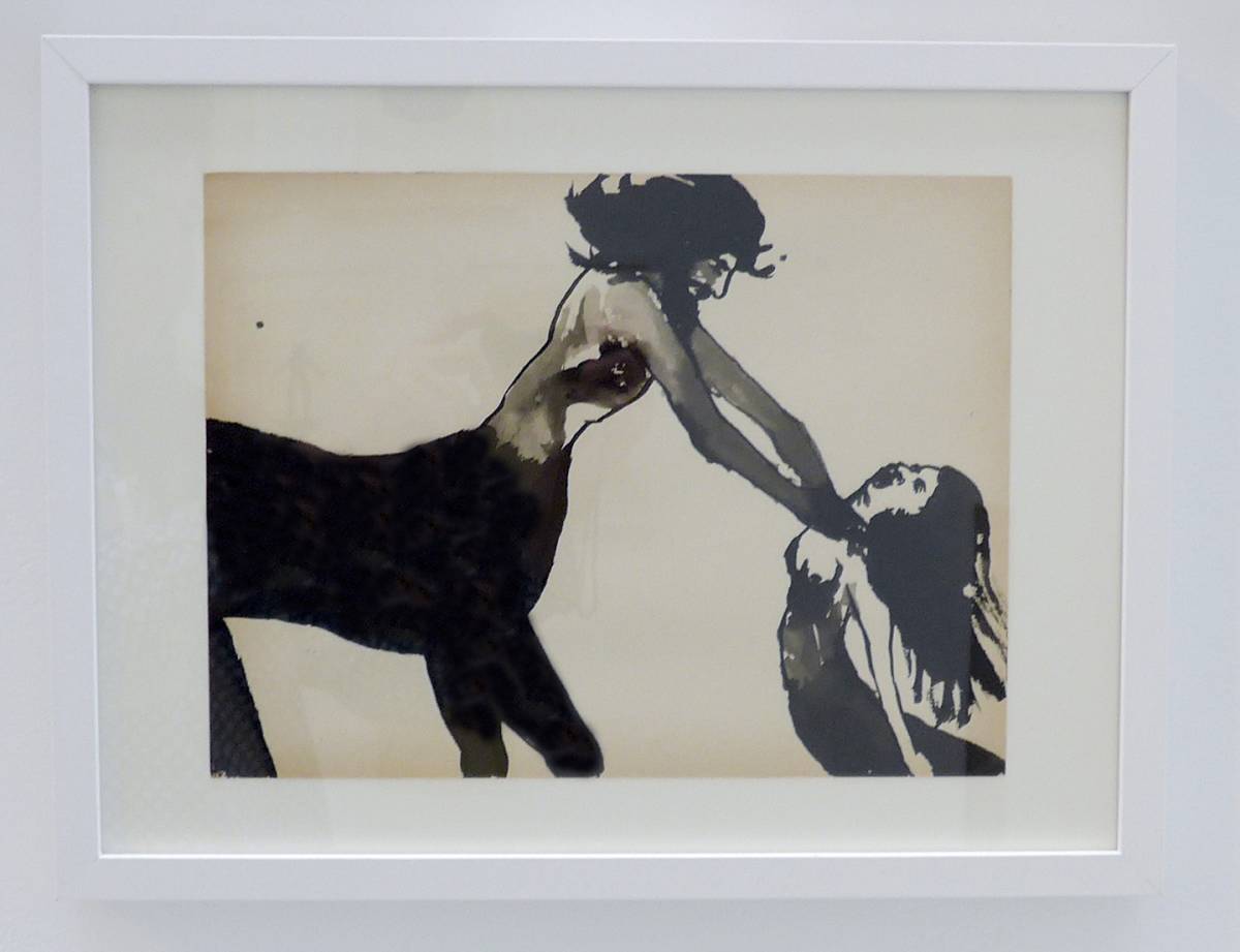 It is easy to be seduced by Gamble’s washed black-and-white tones, reminiscent of those found in some traditional Japanese sumi-e painting. Gamble’s use of the medium to contrast positive and negative fields is striking and impressive. In a good number of her pieces, for example, bottomless white orbs embedded in black faces brilliantly depict eyes peering out into the world.