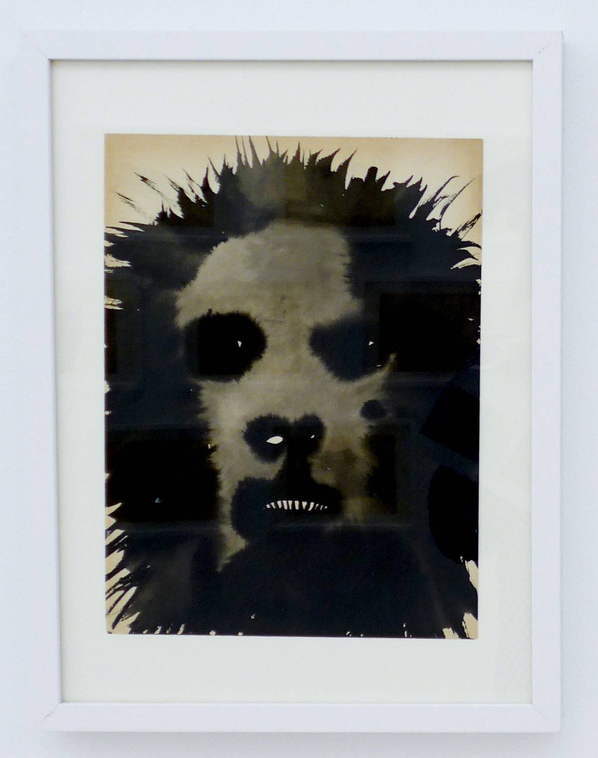 There are a few unremarkable portraits in the exhibit. There are the cat- and dog-monsterish figures, which are not frightening–in fact, even Gamble’s owly cat-monsters fail to invoke our primal feline fears. And there are a series of masked faces and totemic figures–a few of which, such as the black-masked face pictured here, are wonderful and unusual, but many of which seem stereotypical.