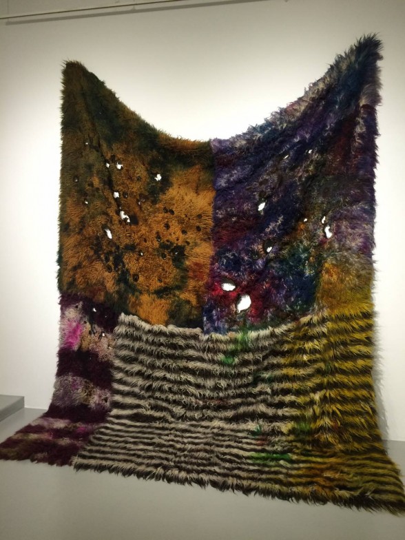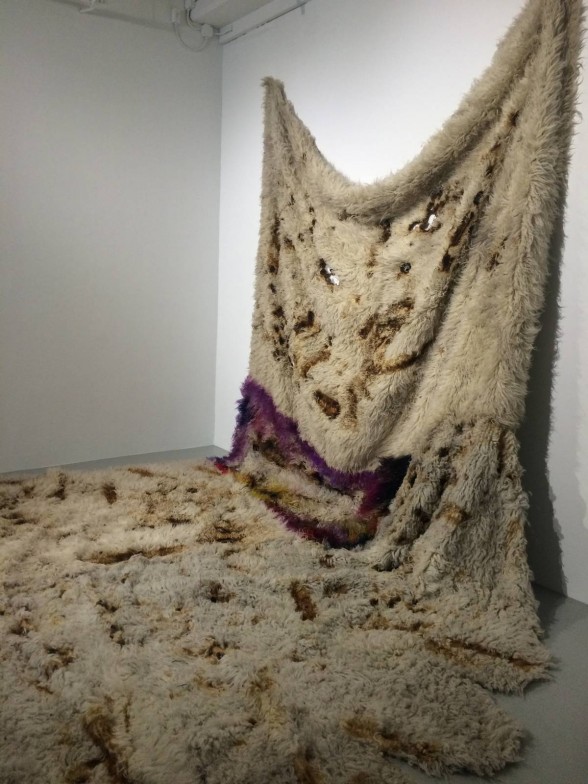 The work I was most impressed with was “Playtime,” because of the artist’s expertise in blurring her materials and destroying the line between what is natural and what is manmade. Some of the rug patchwork is uncannily similar to sea sponge or the delicates tendrils of an anemone, while some of it looks like fur throws ruined with spray paint. I felt the need to keep my distance in case certain stains were in fact toxic black mold, but had the impulse to touch the saturated color, tempted to see if the pigment would dye my fingers brilliant magenta or mustard-yellow.