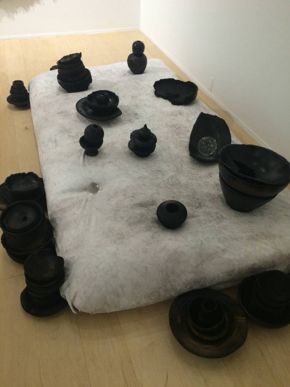In the corner of the gallery, the domestic scene of “Odalisque” is set out. Glass orbs and charred vessels sit on a nimbus-like cushion, surrounded by two tapestries and other small sculpture. This combination of sculpture, architecture, fiber art, and painting creates a formidable installation, meticulous in its composition, with references to ancient dwellings and religious altars. The purity of this work, juxtaposed with the large, bacterial works surrounding it, demonstrates that the elements used to dismantle the material of the fiber work can also create clear glass, snow-white velvet, and sleek, jet bowls.