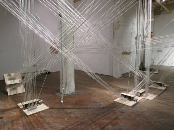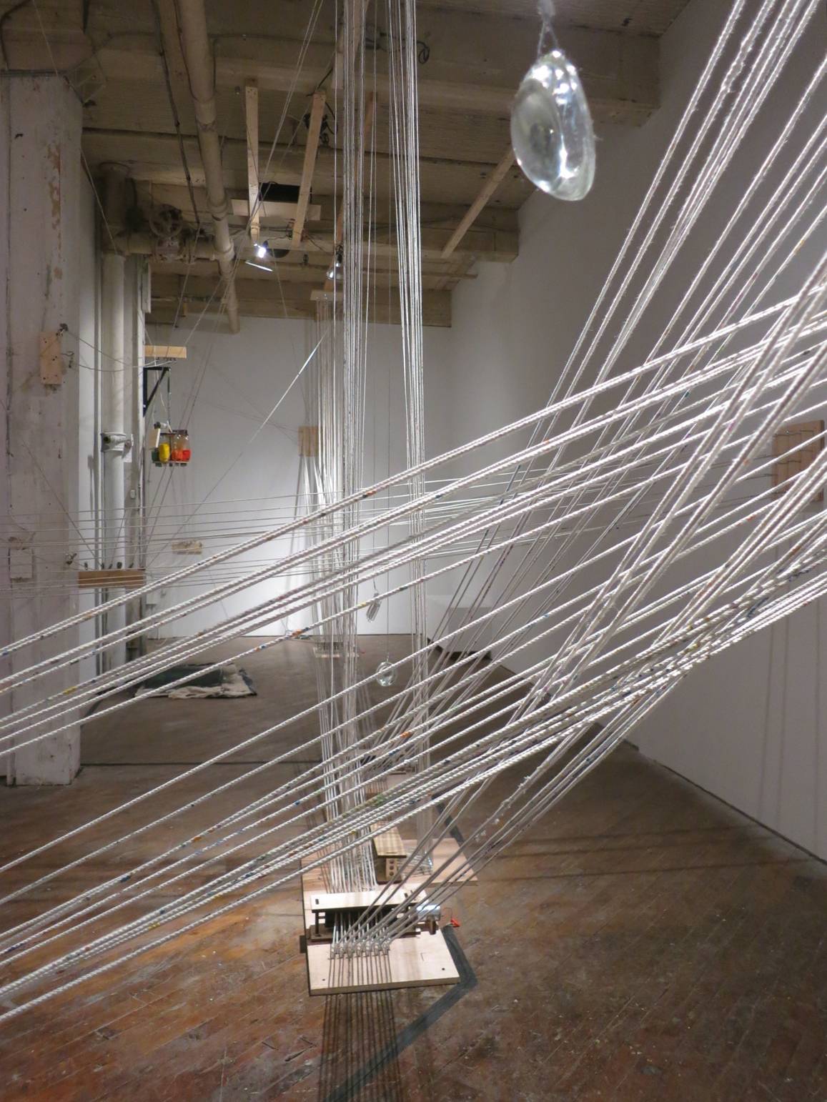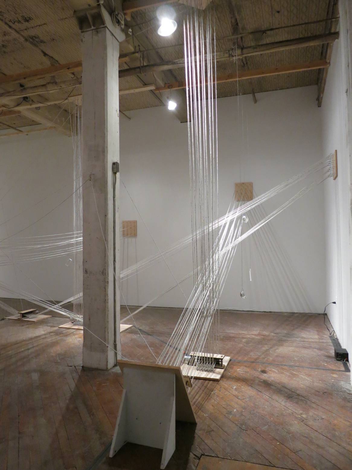 What the images fail to capture is the slow, vibrating, lifelike motion of the installation and the cascade of sounds generated by the motors, all punctuated by claps of a small piece of plywood against the wall at the kill site, part of the process that rotates the plate that houses the dripping ink containers as the strings pass beneath it. The voice of the ink robot.