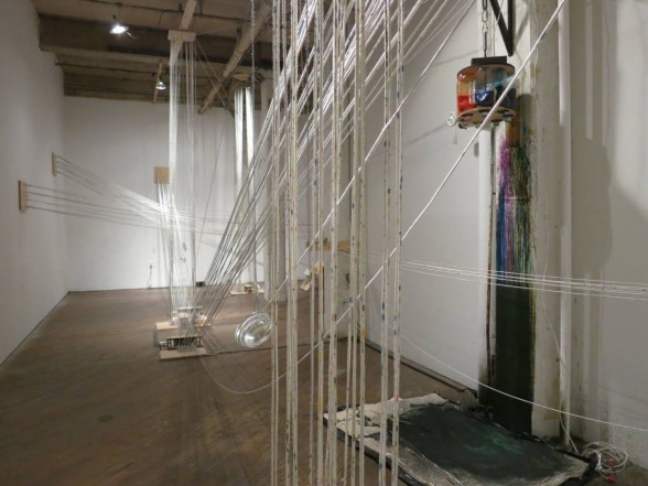 The heart of Douglas Irving Repetto’s installation at Marginal Utility, which is composed of seven elements of thick white cotton string that crawl through a series of hooks and mechanized spools, is the kill site, which represents the locus of an animal’s decomposition in a forest. At the kill site, like the return of animal matter to the earth (and beyond), random codes of color are imprinted upon the strings as they pass through the site, and the strings then carry those codes throughout the universe of the installation. One is reminded of the phenomenon that we all are the remnants of stars.