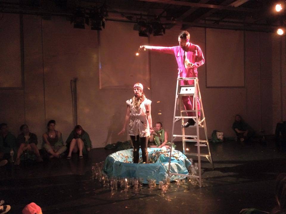 Enter an odd retrospective framed as a humorous sideshow. Lighthearted clowns Christina Zani and partner Scott McPheeters guide us with tongue in cheek, commenting on and briskly recreating several parodies of famous performance works and artists. Zani immediately names the piece as appropriation within HERSTORY. (Note: She speaks with a performed “Southern” accent.) This immediacy places a negative connotation on each of the vignettes that the duo performs. This is like a Mummer’s Day Parade, a mimicry done without giving us a deep understanding of the culture being adopted.