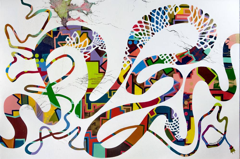 Though the work was once a dense, multicolored painting of various shapes and colors, Kozma used a construction-deconstruction technique to modify “Unplug/Plug”. The work took its present form when the artist placed both wide and narrow yellow chains across the painting and outlined them in undulating widths. Then, she painted out most of the canvas in white, leaving the underpainting pulsating in fat and skinny, colorful squiggles with an electric plug at one end. It is a tour de force.