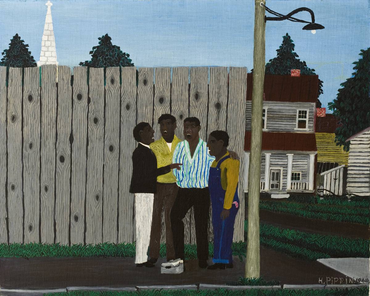 Luckily for West Chester, Pippin paid some homage to his hometown (although he did spend a good portion of his youth in Goshen, New York) with images of daily life as he once knew it. Simple scenes of small-town life, like that in the painting “Harmonizing,” are peaceful glimpses into Pippin’s adolescence and are also very much representative of the African-American experience in the first half of the 20th century. Pippin’s life under segregation and the isolation of black communities at this point in history likely shaped some of his poignant imagery of dynamics between family and friends.