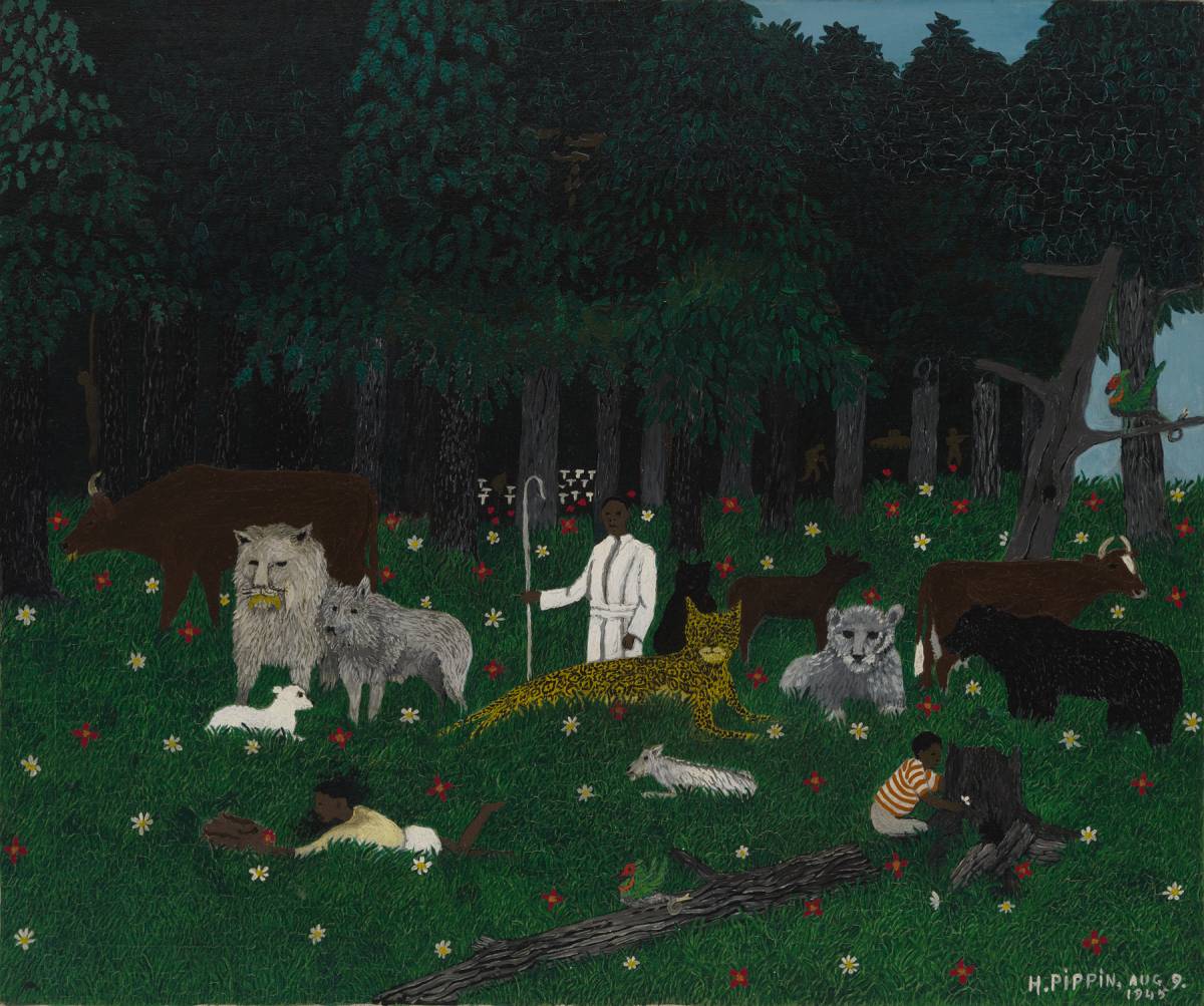 It isn’t easy to categorize Pippin, and giving him the all-too-vague label of “self-taught artist” can overshadow his immensely technical and innovative approach to his subject matter. “The Holy Mountain III,” one of a small series inspired by Edward Hicks’ “The Peaceable Kingdom,” is a good example. The scene depicts a utopia; however, in the corner, a shadowy silhouette of a body hanging from a noose can be made out, along with lurking soldiers between trees. The muted images of a foreboding evil that haunts the background of the otherwise peaceful scene are very telling of the complex manner in which Pippin approached his art. Despite the darkness of the imagery, which alludes to his time in the Army and his direct knowledge of violent racism in America, Pippin’s engagingly whimsical painting technique still allows the viewer to connect and interact with the piece. Pippin’s work is welcoming, even in the most uncomfortable of circumstances.