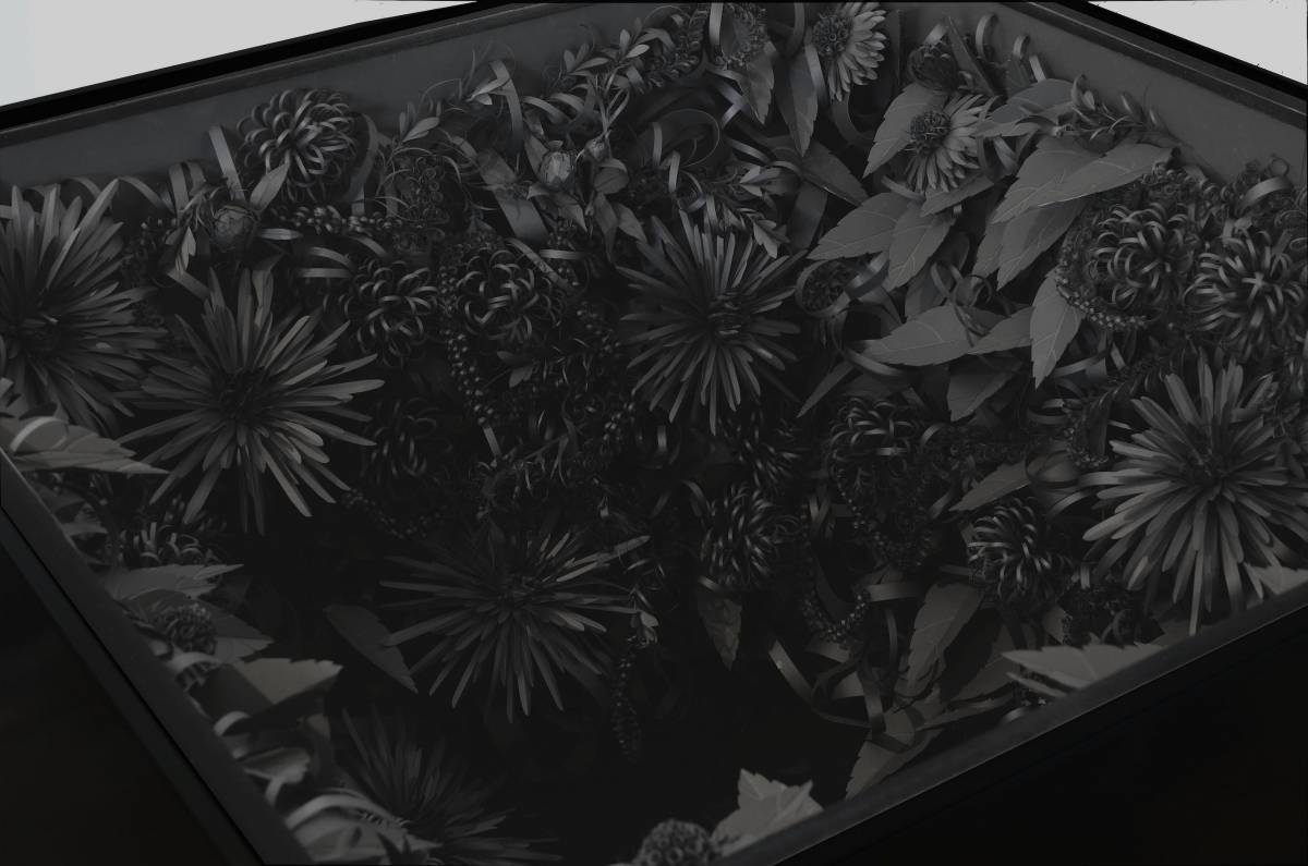 Fensterstock’s gallery, Sienna Patti Contemporary in Lenox, Massachusetts, has published a monograph, Radical Sentimentalism: The Work of Lauren Fensterstock, including an essay by the artist, critic, and poet Carol Diehl. I found the following quote from Diehl’s essay on the Sienna Patti website: “Both tempting and threatening, Fensterstock creates objects of desire whose beauty draws us in, only to repel with intimations of dark secrets. This tension culminates in an illusion of depth and motion that leaves viewers with the eerie sensation that these shadow gardens have a sinister life–one that will cause them to grow and change long after we have left the room.”