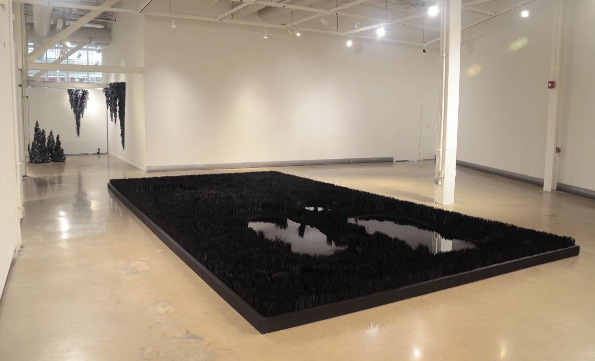 Standing before Lauren Fensterstock’s magnificent installation “Colorless Field,” pictured below, I had two associations. First, I was reminded of a black-and-white bird’s-eye photograph of New York’s Central Park. Then I recalled something I learned years back: that if you take the most perfectly round ball bearing that human technology can manufacture and blow it up to the size of the Earth, it will have mountains higher than Mount Everest and valleys deeper than the Grand Canyon.