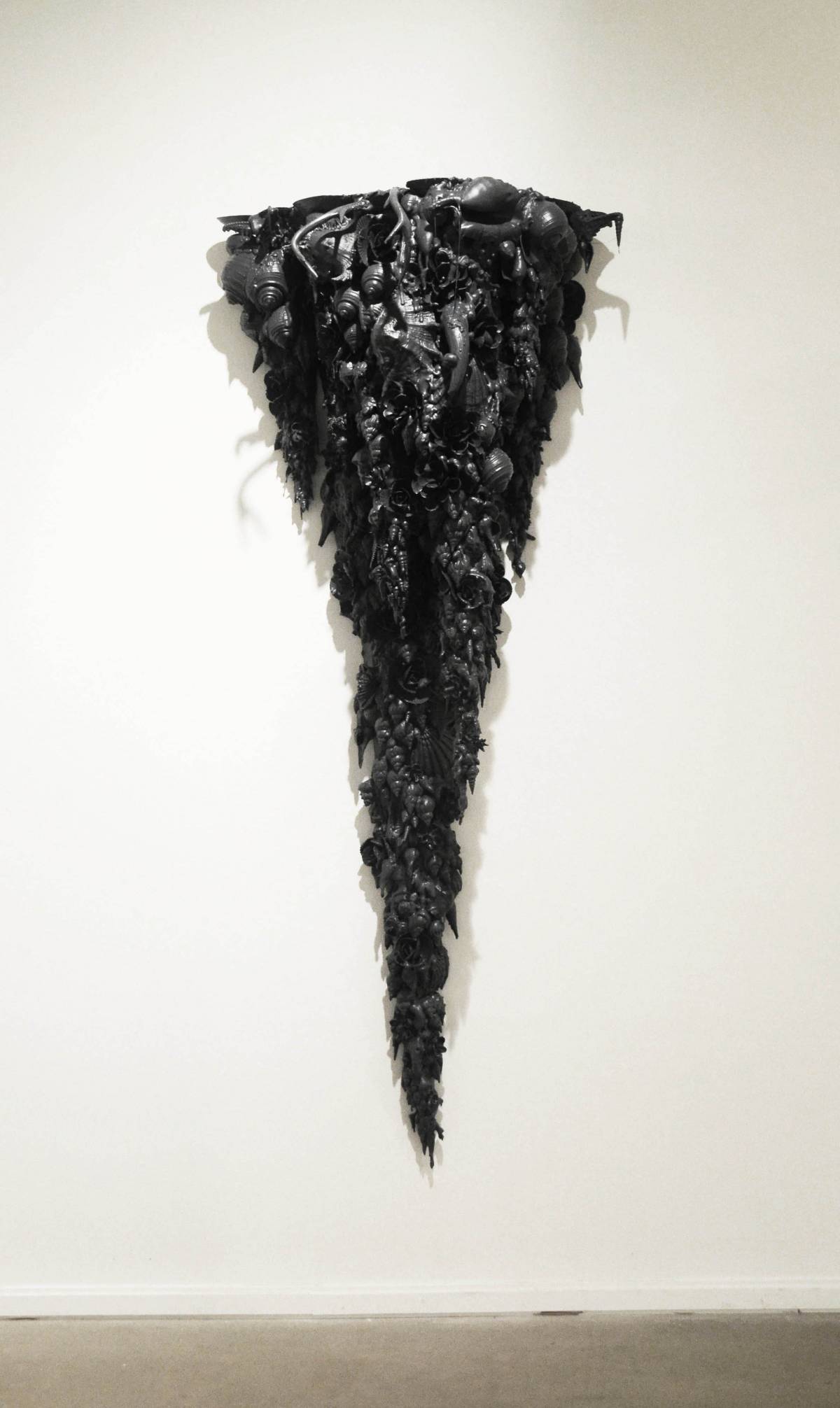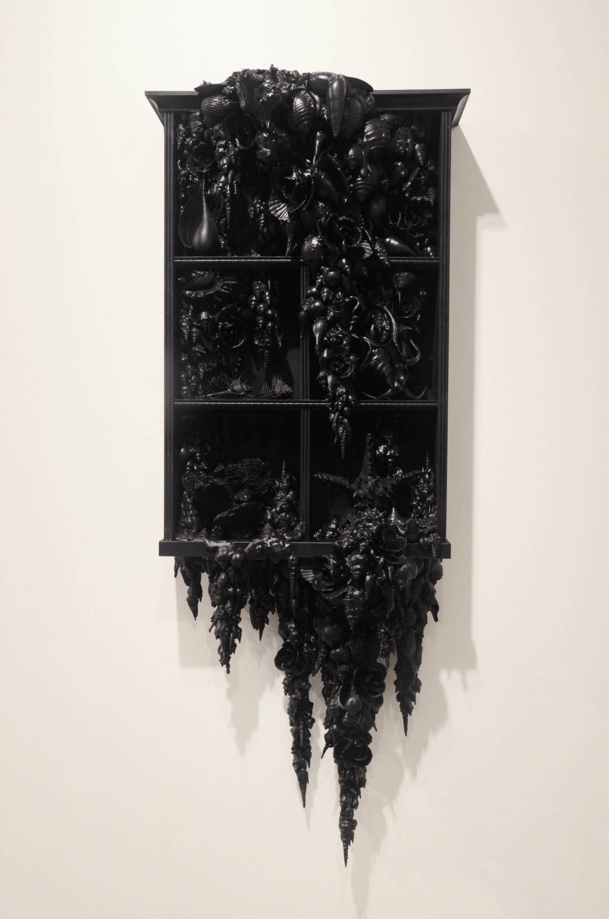 The other works on display in the exhibition are far smaller, but all of them likewise are monochromatic black and charcoal, and they reflect Fensterstock’s obsession with traditional gardens, flora, fauna, seashells, garden grottoes (artificial caves) and caves. There are incredibly intricate, dripping stalagmites and dioramas filled with black, rubber-coated shells, plant and animal life, much of it hand-cut from paper, and black Victorian mirrors that add an element of eerie reflectiveness. A number of these pieces, most of which readily hang on the walls of the gallery, are pictured below. The detail and fecundity are unbelievable. But the ubiquitous dark monochromaticity of the pieces makes them seem petrified, desolate, dense, extravagant, and unsettling. They are reminiscent of, although far more intense than Petah Coyne’s pre-2008 sculptures.