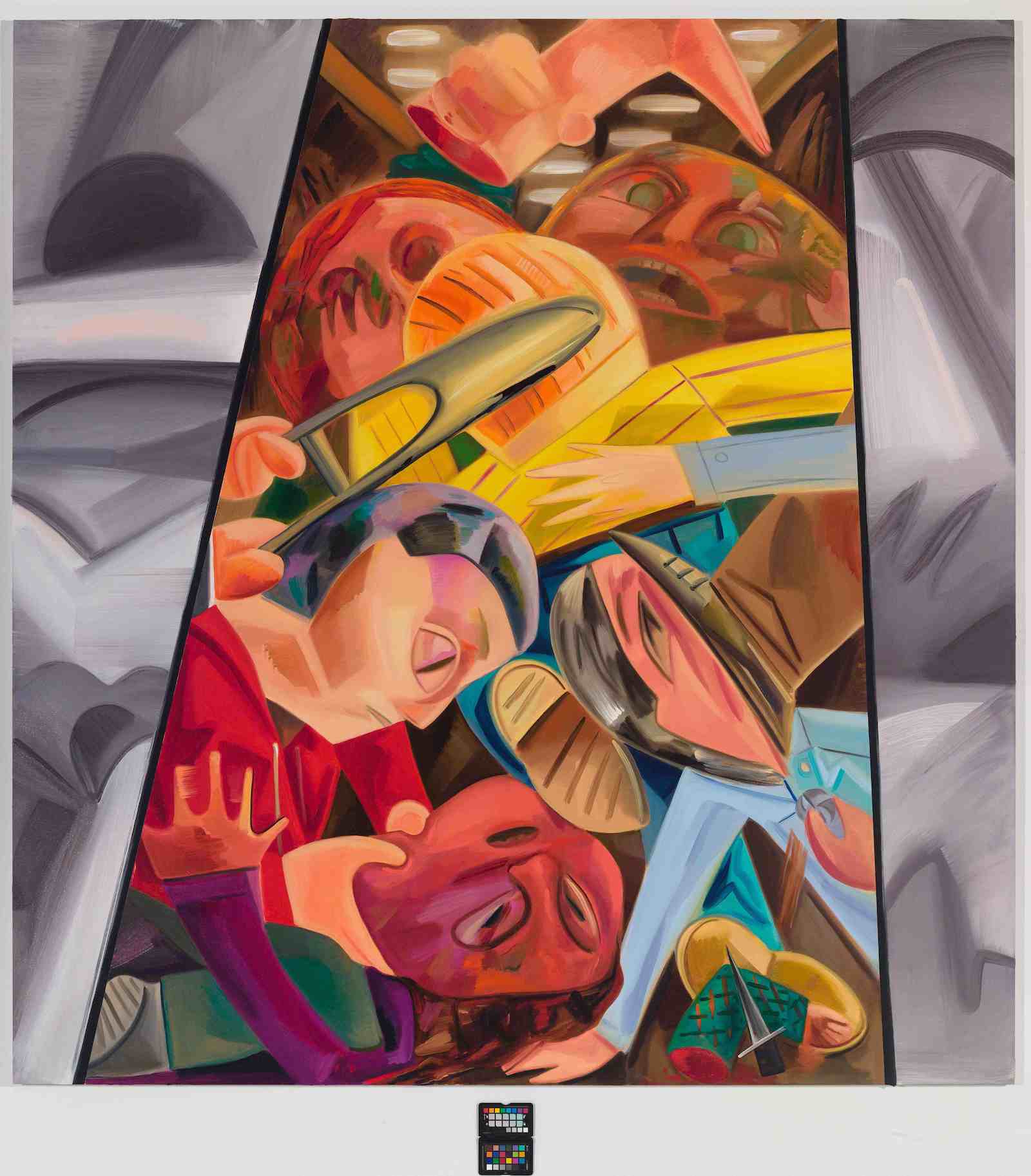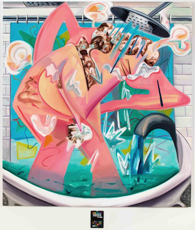 In any event, I venture to suggest that this is the first time the subject has appeared in a work of non-pornographic art. And this wonderful, offbeat subject matter uniqueness is typical of Schutz’s work and distinguishes her as an artist and as a thinker. In Schultz’s work, you find modern life portrayed through a discombobulating brawl in an elevator (perhaps take-offs on the tales of Jay-Z and Beyoncé’s sister, Solange, and Ray Rice and Janay Palmer); a lion eating its tamer; a sleepwalker; a slow-motion shower (in which there are no boundaries: everything, including the bather, is fluid); a stoned and freaked-out driver at a police stop; a strange, colorful Yoda-like figure with large, hanging eggplant testicles, carrying a basketball.