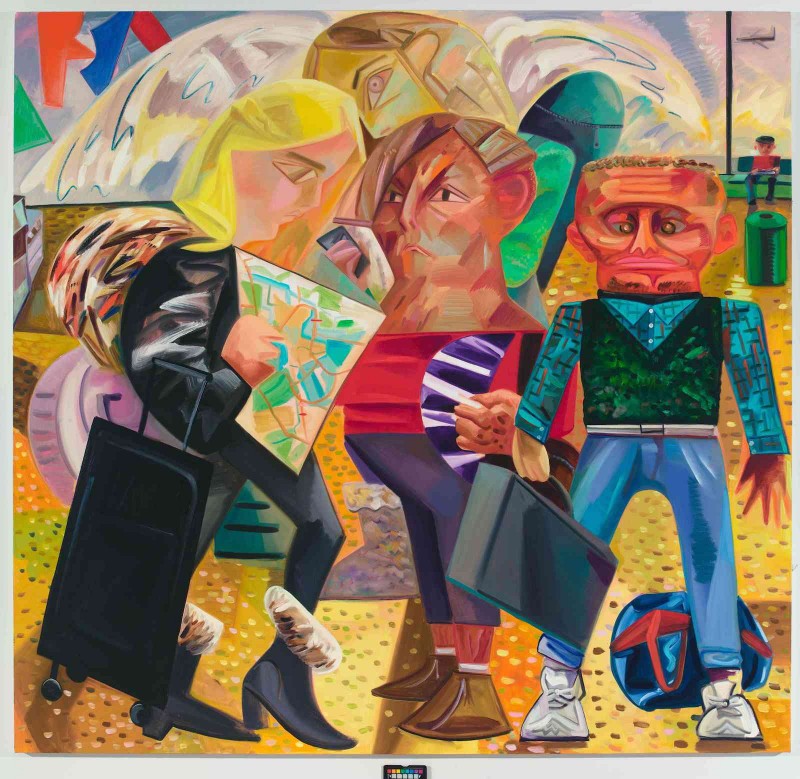 Schutz’s “Swiss Family Traveling” is approximately 7 feet square, and I think an interesting example of her work. Note the fabulous color scheme, the odd, but perfect expressiveness of the figures and the compression of space. Schutz brilliantly captures this scene with a masterful simplicity that contrasts sharply with the Penn Station-at-rush-hour complexity you find in a number of her other paintings.