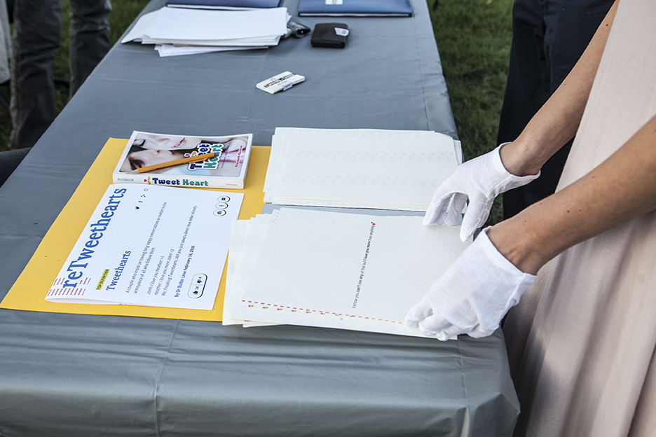 Margot Herster of BUREAU of CHANGE created sets of two-page “retweethearts printed on fine writing paper,” each with an image or text sourced from Twitter and a patterned page based on the tweet’s emojis. In a funny but probably practical twist, visitors were required to wear gloves to browse the tweets.
