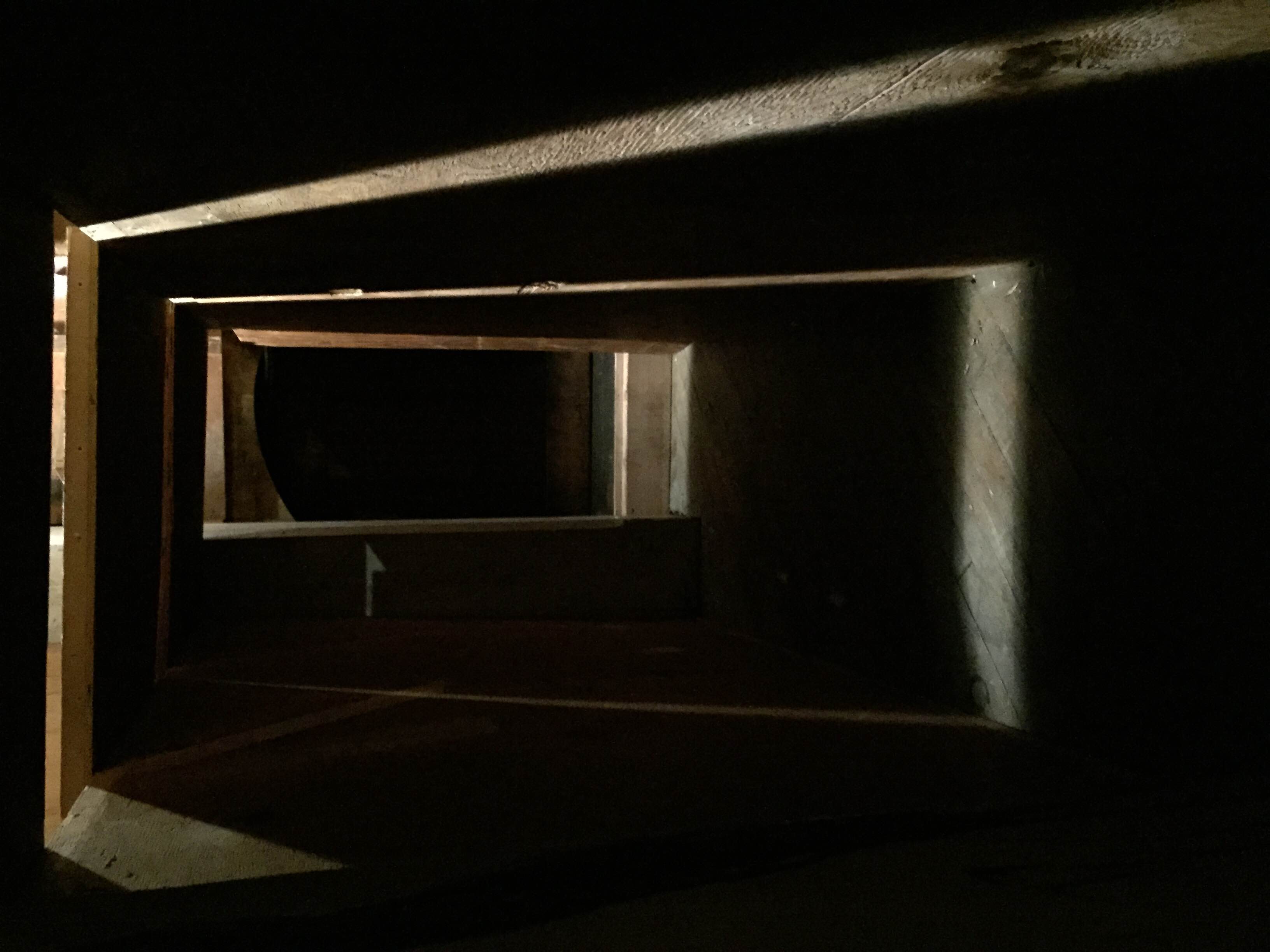 After we look through the peepholes, we turn a sharp corner and it seems like we cannot move forward. Crawling, we arrive at what may be the dead end of the passage, but it gives a little. With another push, the tunnel opens up into a hallway. And, once again, we are standing. We look back to see that we have come through a wooden cabinet. On its door, a framed cross-stitch sampler commemorating Kip’s birth hangs crookedly, the artist’s symbolic signature on the passageway from which we have just emerged.