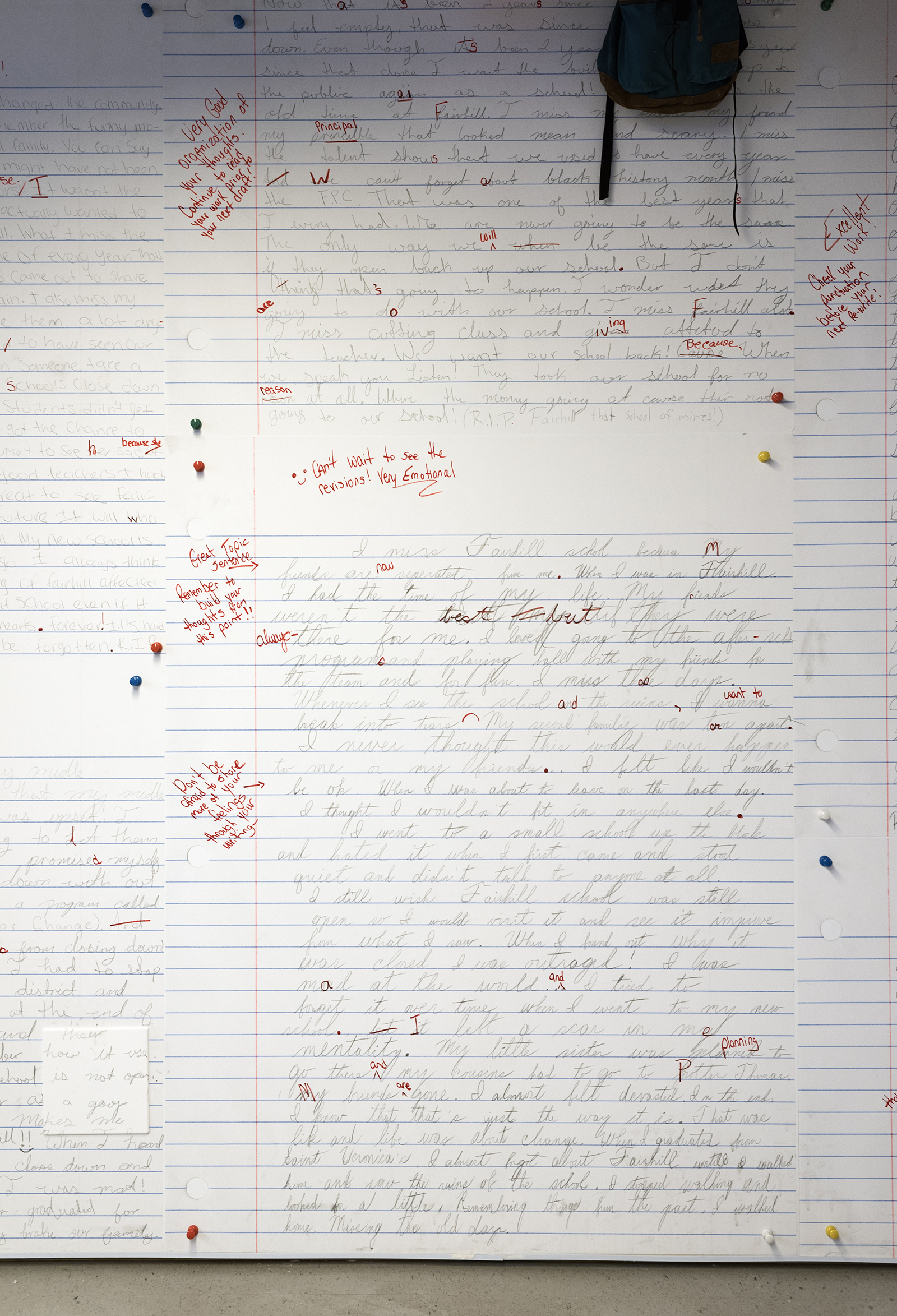 The essays—complete with teachers’ red marks and encouraging words—include consistent reference to memory and loss. One essay ends: “I want nothing more than for my school to be reopened and memories restored.” This reference to memory is one of the most compelling aspects of reForm. The installation provides, as Osorio puts it, “a landscape of memory”. Indeed, the reflection on this past event—the school’s closing—in the present moment becomes a direct negotiation with the students’ futures and gives Fairhill its own historical memory.