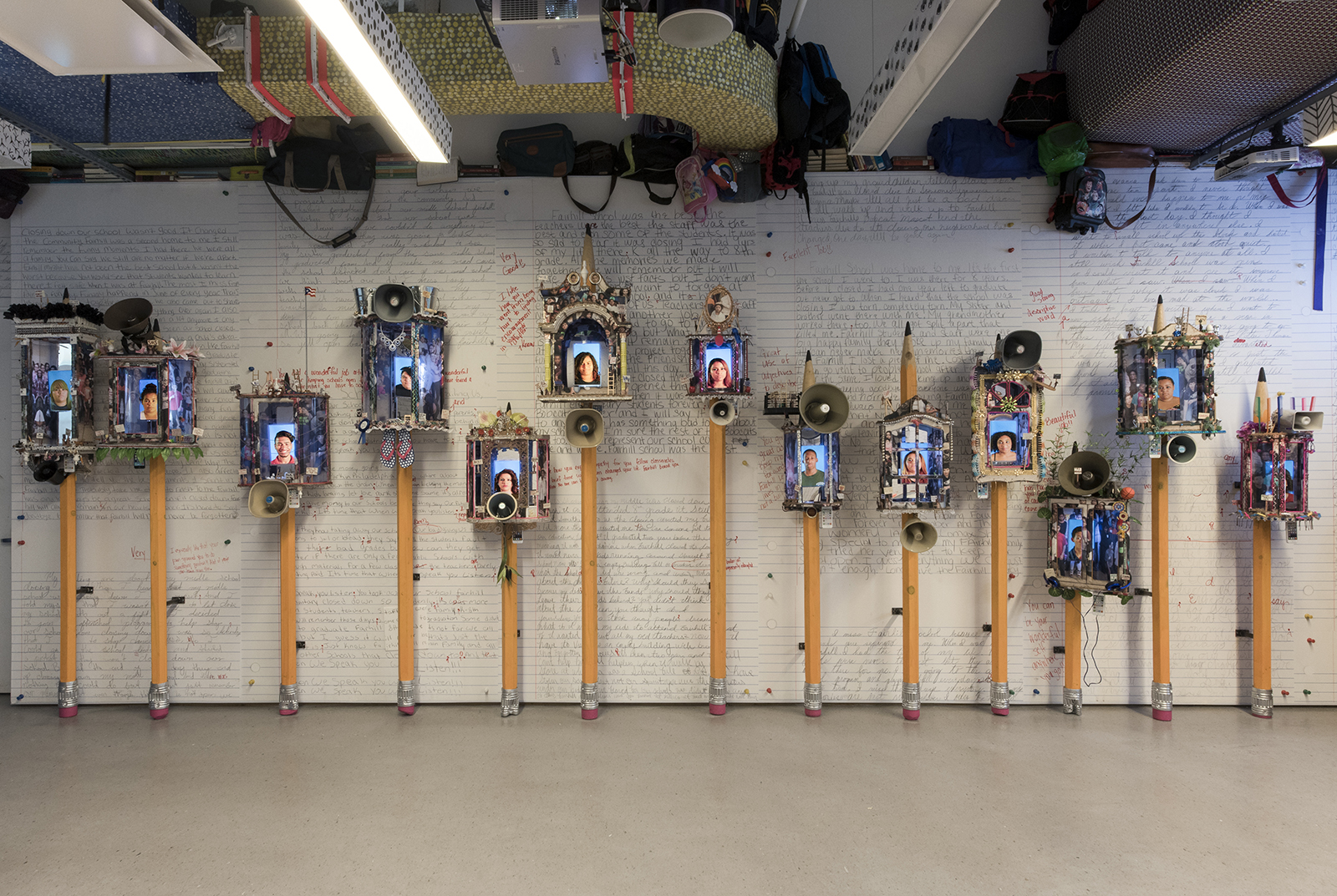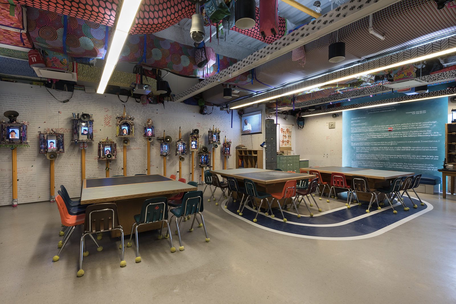 In 2013, Fairhill Elementary School—in a largely Latino neighborhood near Temple University—was one of two dozen public schools shut down by the Philadelphia School Reform Commission. Artist Pepón Osorio biked past Fairhill on his daily commute to Tyler School of Art and began reflecting on the physical structure of the building. In an interview, the artist described it as “a huge architectural skeleton in the middle of a community”. He started discussing the school’s closing with Tim Gibbon, an artist and former teacher at Fairhill. While the physicality of the school struck Osorio, he became more interested in the people affected by its closing.