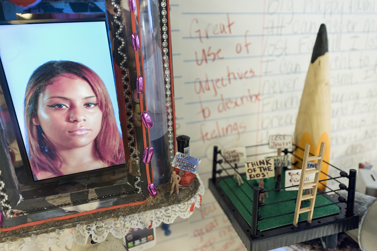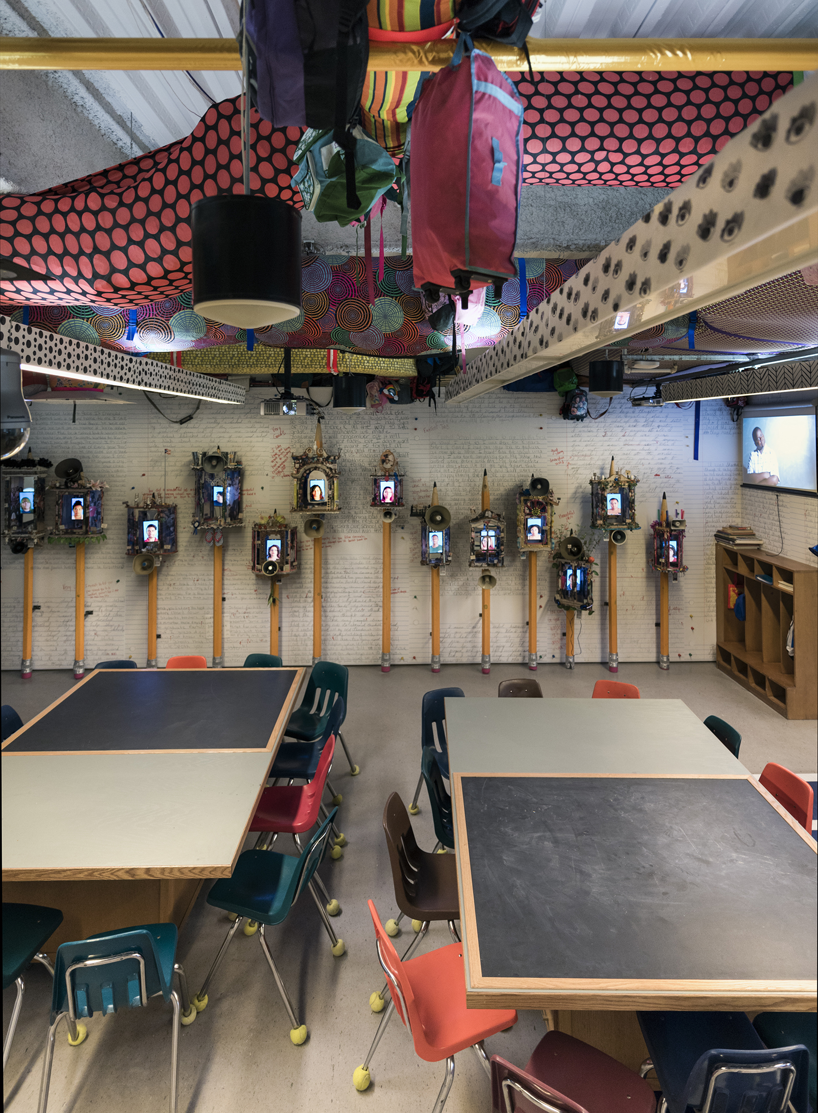 Every inch of the windowless room is covered in color, texture, and language. One corner is a miniature science lab; a section of the floor is filled with books on Mayan symbolism and US history; and a wall is lined with sculptural pencils topped with the faces of the participating youth peering out from digital tablets. On the back wall is the letter sent to parents announcing the closing of the school. And in the middle of the room are two large tables covered with chalkboards and chalk, surrounded by chairs for visitors to sit down and take it all in.