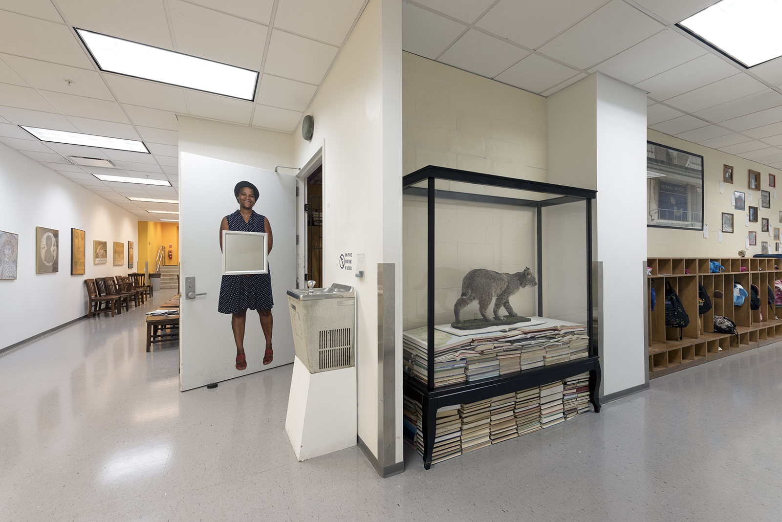 The installation—nearly 80 percent of which is made up of materials recovered from the school—is extraordinary. Entering the exhibition, you pass through a cubby-lined hallway filled with backpacks and coats, as well as Fairhill’s taxidermied mascot on a pile of books. Photographs documenting the project’s process, including the class reunion photo, line the wall above. Turning the corner, you are greeted by a smiling, life-size image of Fairhill’s former principal on the door, and upon entering the converted studio space, you encounter what can only be described as a fantastical classroom.