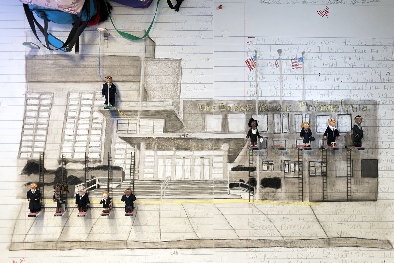 In the spring of 2015, they turned their conversation into something more tangible. Teaming up with Temple Contemporary and securing a substantial grant from the Pew Center for Arts & Heritage, they started conceptualizing how to translate the emotional aspects of the school’s closing—frustration, pain, deception, longing—into visual imagery. Osorio was particularly inspired by the idea of layering communities on top of one another, placing a school within a school to prompt questions about public education, historical legacies, and civil activism. With stipends from Temple, the youth could spend their summer working on the project. From Monday to Thursday all summer, Osorio and the youth met, conversed, and worked.