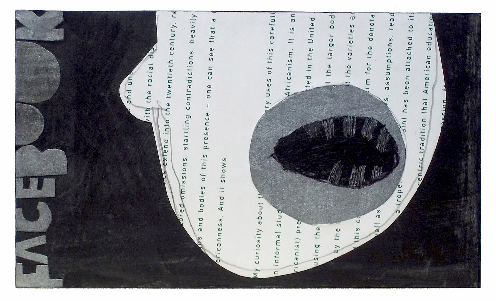 On the 12 sides of an accordion art book are partial shapes of facial expressions in silver or printed gray words on white paper, with lips of red, black, or silver. You can pick the book up and turn it around to capture each facial expression. And when you put it down, glance at its title: “Facebook”.