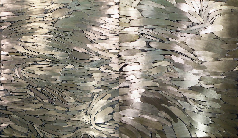 Her large paintings are made from discarded aluminum printing plates from a New Jersey print shop, where her husband once worked. She sands the aluminum down, cuts it in abstract shapes—using her late uncle’s barber shears, which she rescued from the trash — and then covers wooden panels with aluminum shapes or strips, and then paints them—or not.