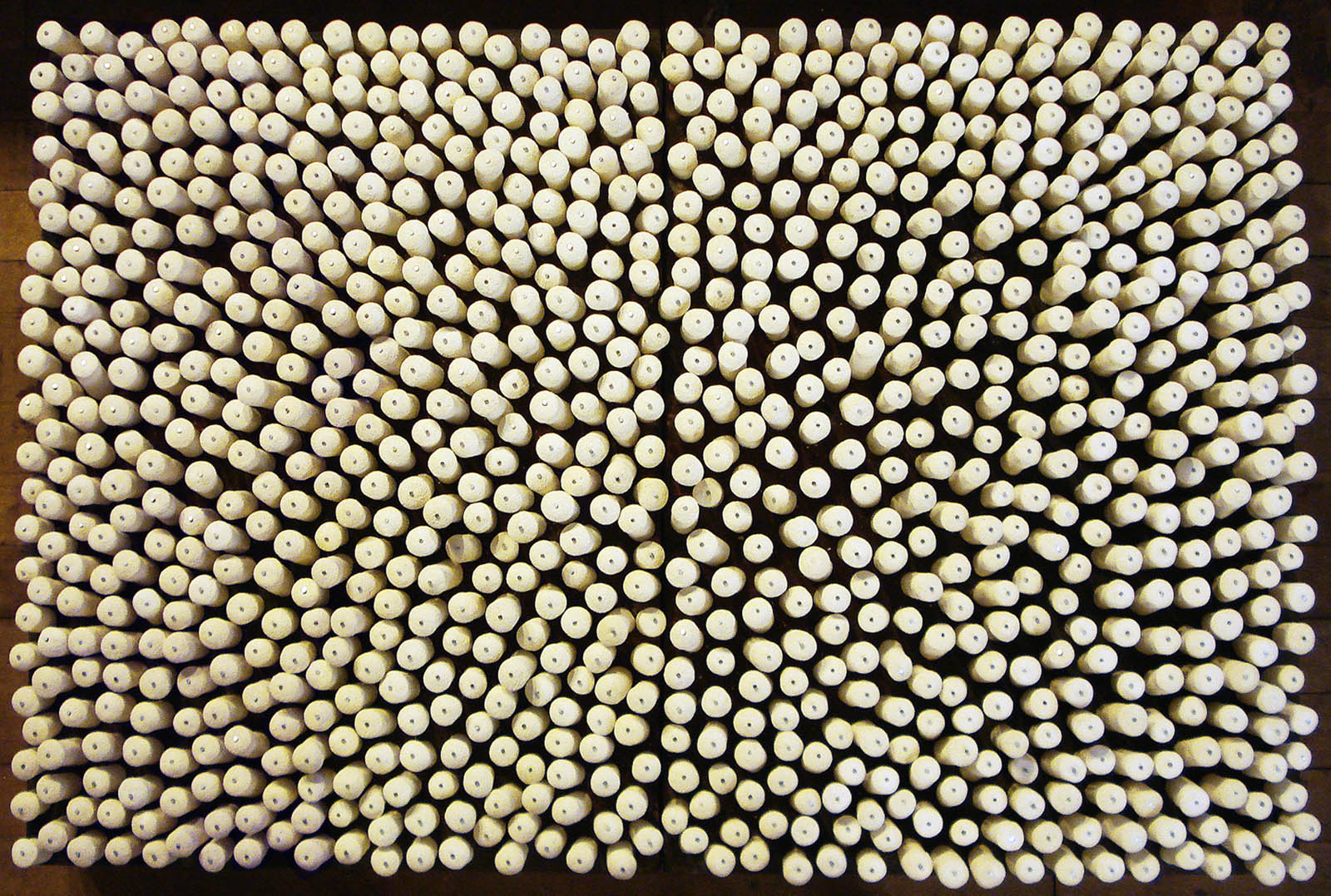 A display of small and smaller fat fingers of hardened clay, sides pressed together, sits on a 36-inch by 24-inch wood panel. Its title: “Population Explosion”.