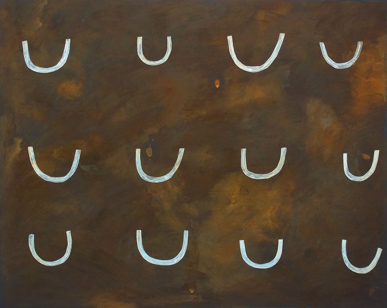 So too, with a rusted-looking painting adorned with white U-shapes. The name of the 30-inch by 20-inch work: “U-Tube”.