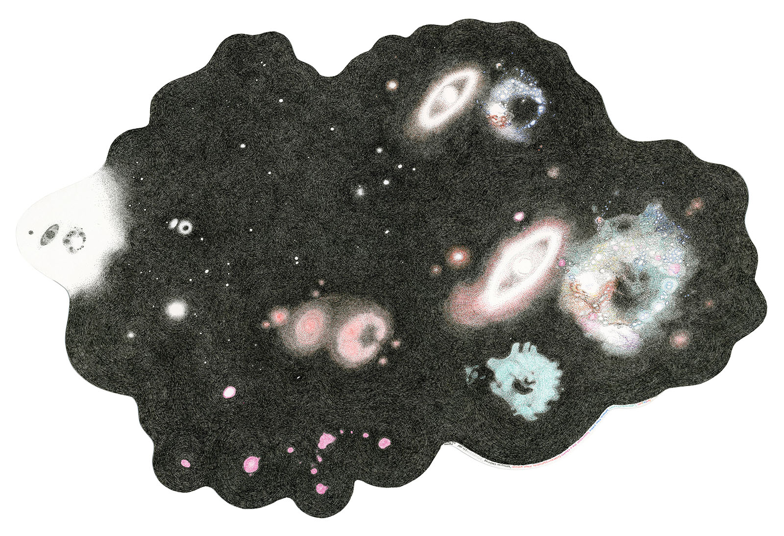 The drawings in Rosenthal’s exhibition Paper Lens, now showing at PAFA’s bright and beautiful Morris Gallery, actually deal with a concept of great concern in present-day particle physics, astrophysics, and metaphysics: the existence of dark matter. They have titles such as “Ultra Deep Field (Dark Matter)”; “Expanding Universe”; and “Nothing to See Here”. And they live up to their names.