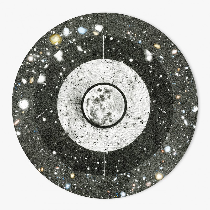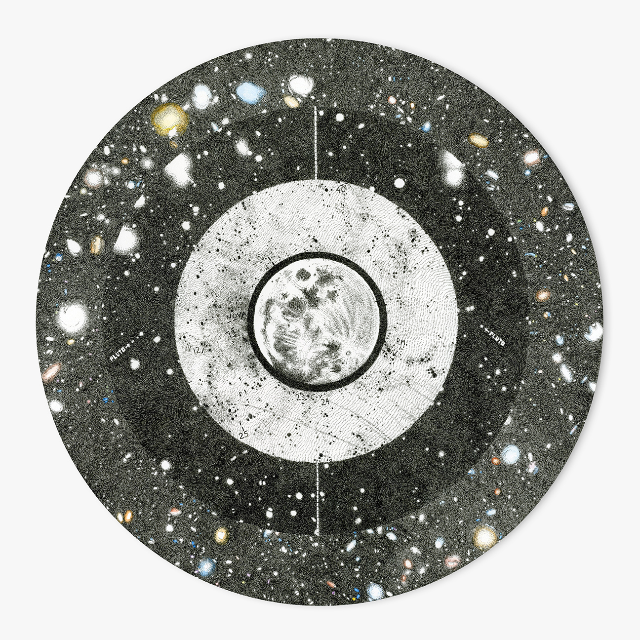 One remarkable note: The world portrayed in Rosenthal’s work here is essentially spherical, mirroring celestial objects (and perhaps subatomic particles as well), and mirroring the actual loop of the collider, and this rejection of the rectangular renders her work almost primordial. A number of these spherical pieces are actually a composite of images from various sources. In “Telescope,” pictured above, for example, there are four rings that are drawn from the center out. The center comes from Galileo’s observation of the moon using a Galilean telescope. The first ring is drawn from a photographic plate from the work of the “Harvard Observatory computers,” in which a group of women who worked in the early 20th century painstakingly recorded star brightness in the photographic slides at the Harvard Observatory. The second ring is drawn from images from the discovery of Pluto. And the outer ring comes from a Hubble telescope image of the Ultra Deep Field. The Ultra Deep Field, as I understand it, consists of stitched-together images of scores of galaxies, some as far as 13 billion light-years away from Earth, which Hubble discovered in an area of black sky.