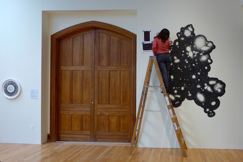 The exhibition also includes a large wall drawing, essentially a performance piece, titled “Expanding Universe,” to which Rosenthal has devoted over 40 hours working in the gallery, and which will be painted over at the end of the exhibition. Although this has afforded the public an opportunity to witness the skill of this artist at work, there is something sad about its impermanence. I suppose its evanescence mirrors the subject matter she is exploring in this ambitious project.
