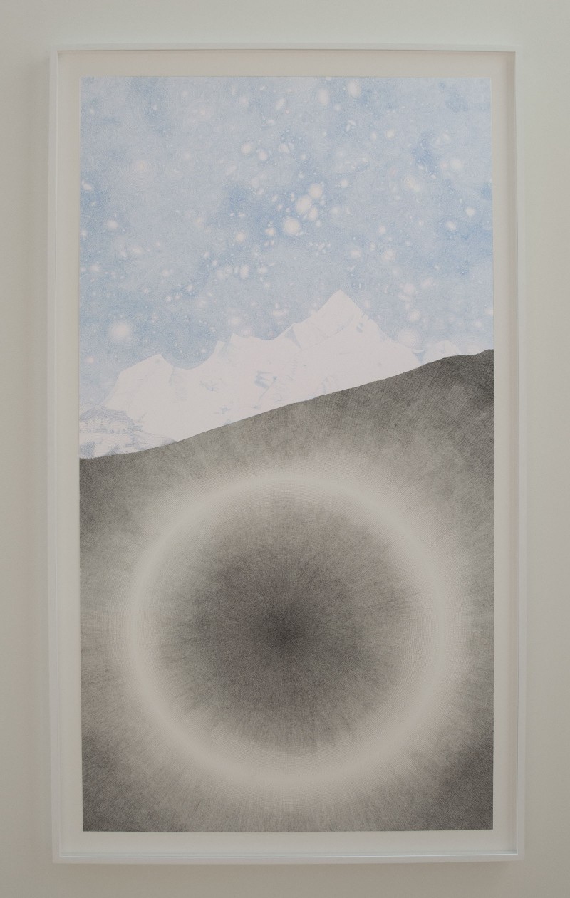Bravely, although some may conclude that she is flirting with the impossible, Rosenthal has incorporated her conception of the collider, both what it is and what it does, into her work. In her own words: “It was a challenge to consider how I might make a drawing that incorporated realities of the universe that exist but are not directly visible. I had read a statistic that the makeup of the universe is approximately 68 percent dark energy, 27 percent dark matter, and only 5 percent is observable matter (with a good chunk of that being hydrogen). How might I translate this into something visual?”